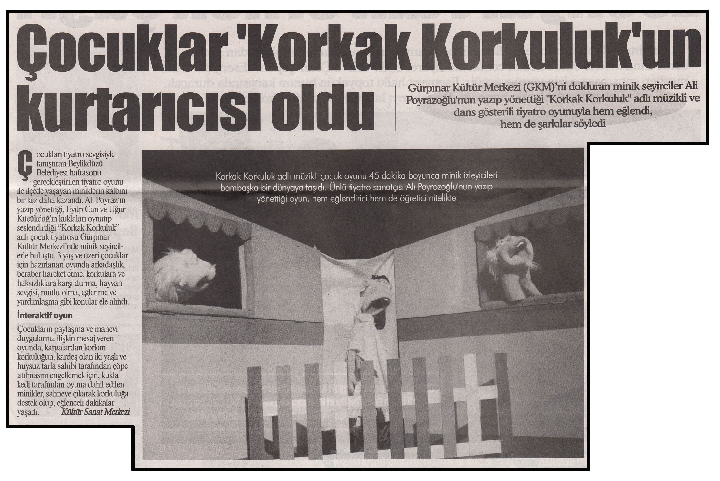 11 Haziran 2014 tarihli "GAZETE İSTANBUL" gazetesi. Gürpınar Kültür Merkezi (GKM)'ni dolduran minik seyirciler Ali Poyrazoğlu'nun yazıp yönettiği "Korkak Korkuluk" adlı müzikli ve dans gösterili tiyatro oyunuyla hem eğlendi, hem de şarkılar söyledi.