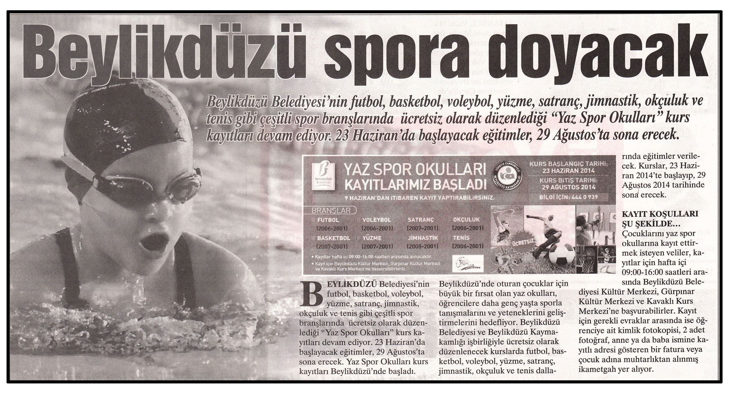 12 Haziran 2014 tarihli "YENİ GÜN" gazetesi. Beylikdüzü Belediyesi'nin futbol, basketbol, voleybol, yüzme, satranç, jimnastik, okçuluk ve tenis gibi çeşitli spor branşlarında ücretsiz olarak düzenlediği "Yaz Spor Okulları" kurs kayıtları devam ediyor. 23 Haziran'da başlayacak eğitimler, 29 Ağustos'ta sona erecek.