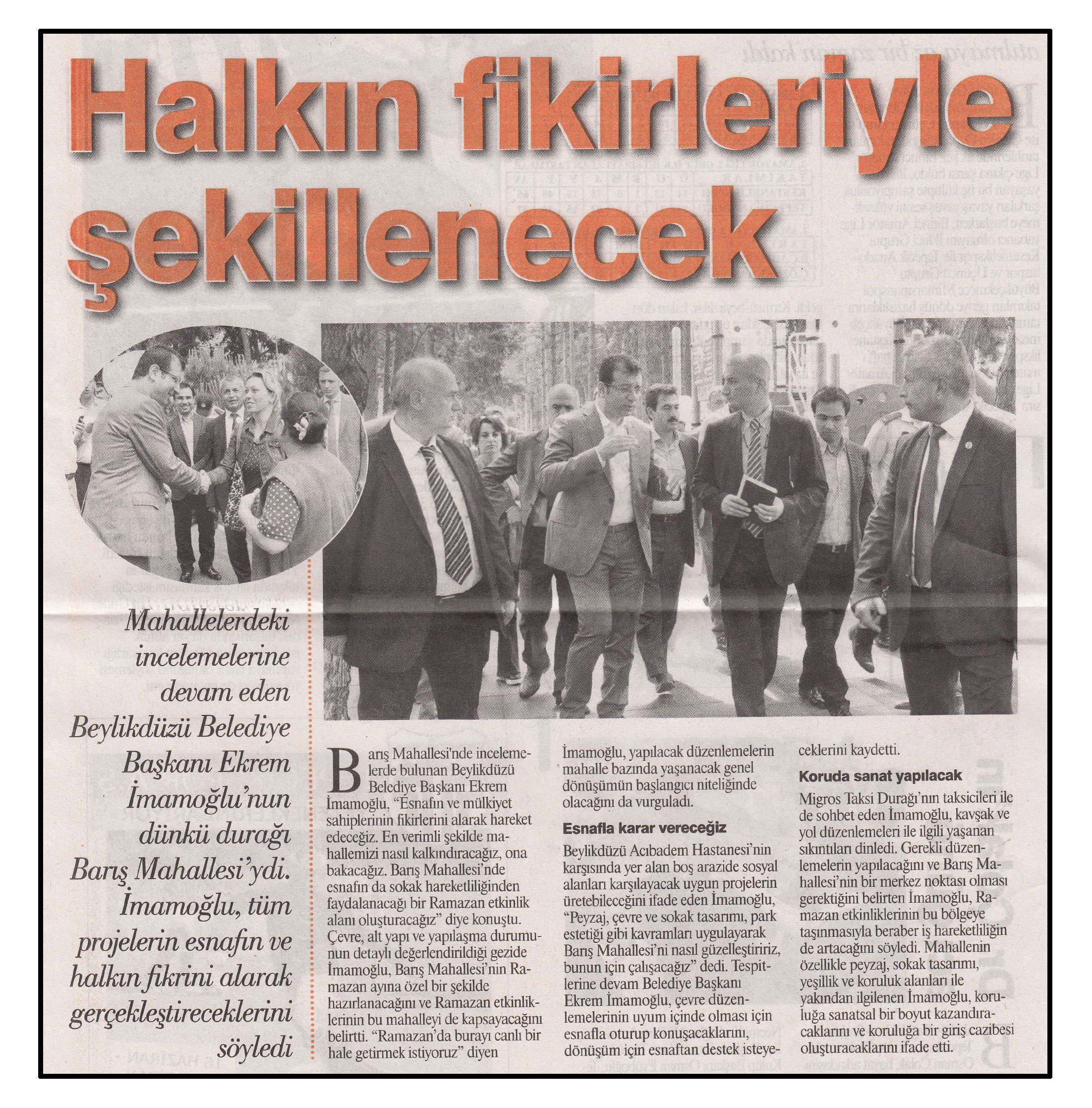 23 Mayıs 2014 tarihli "GERÇEK" gazetesi. Mahallelerdeki incelemelerine devam eden Beylikdüzü Belediye Başkanı Ekrem İmamoğlu'nun dünkü durağı Barış Mahallesi'ydi. İmamoğlu, tüm projelerin esnafı ve halkın fikrini alarak gerçekleştireceklerini söyledi.