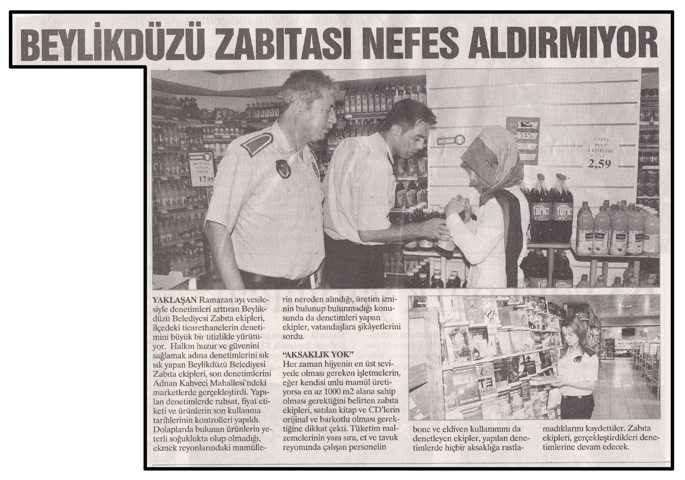 13 Haziran 2014 tarihli "YENİ GÜN" gazetesi. Yaklaşan Ramazan ayı vesilesiyle denetimleri arttıran Beylikdüzü Belediyesi Zabıta ekipleri, ilçedeki ticarethanelerin denetimini büyük bir titizlikle yürütüyor.