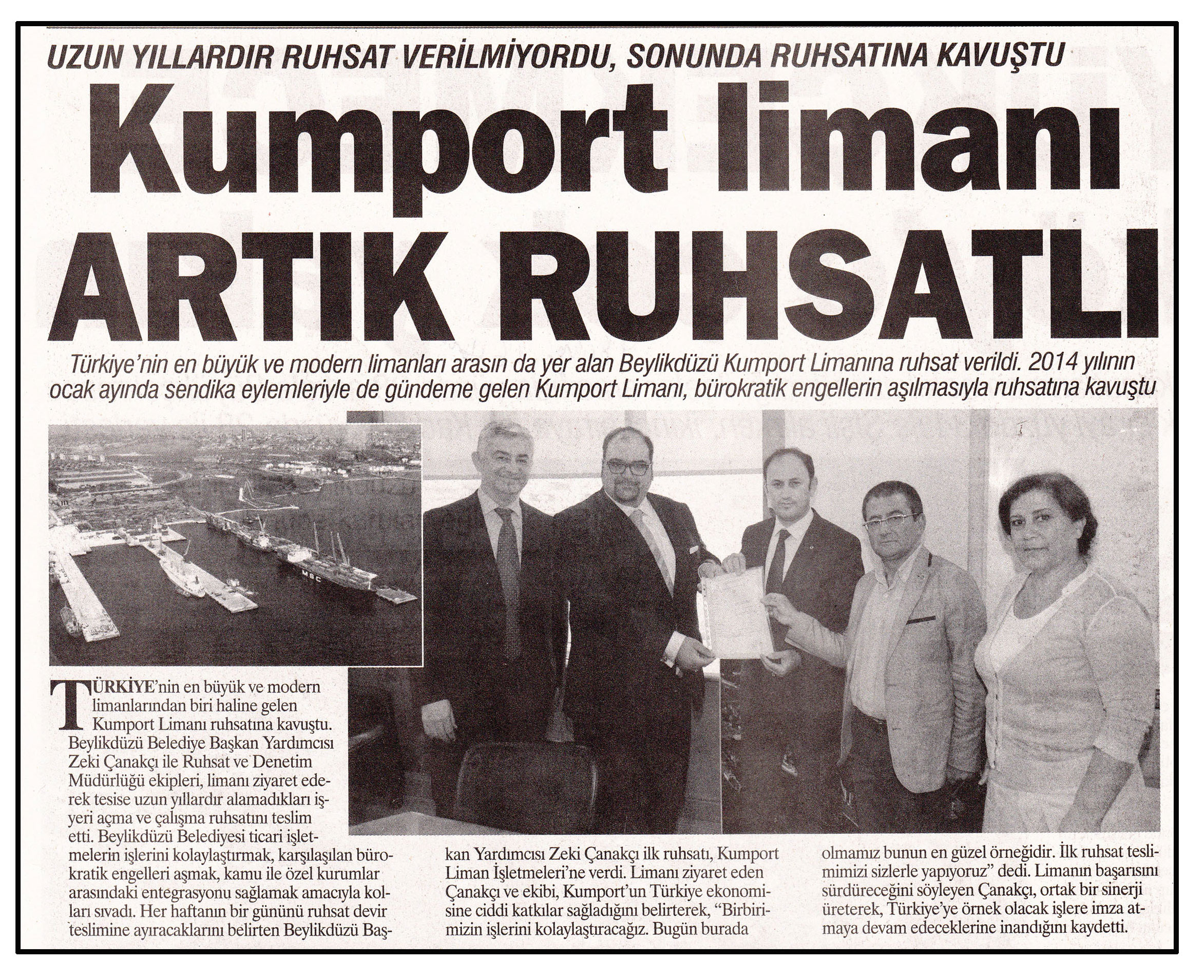 16 Tarihli 2014 tarihli "YÖRÜNGE" gazetesi. Türkiye'nin en büyük ve modern limanları arasın da yer alan Beylikdüzü Kumport Limanına ruhsat verildi. 2014 yılının ocak ayında sendika eylemleriyle de gündeme gelen Kumport Limanı, bürokratik engellerin aşılmasıyla ruhsatına kavuştu.