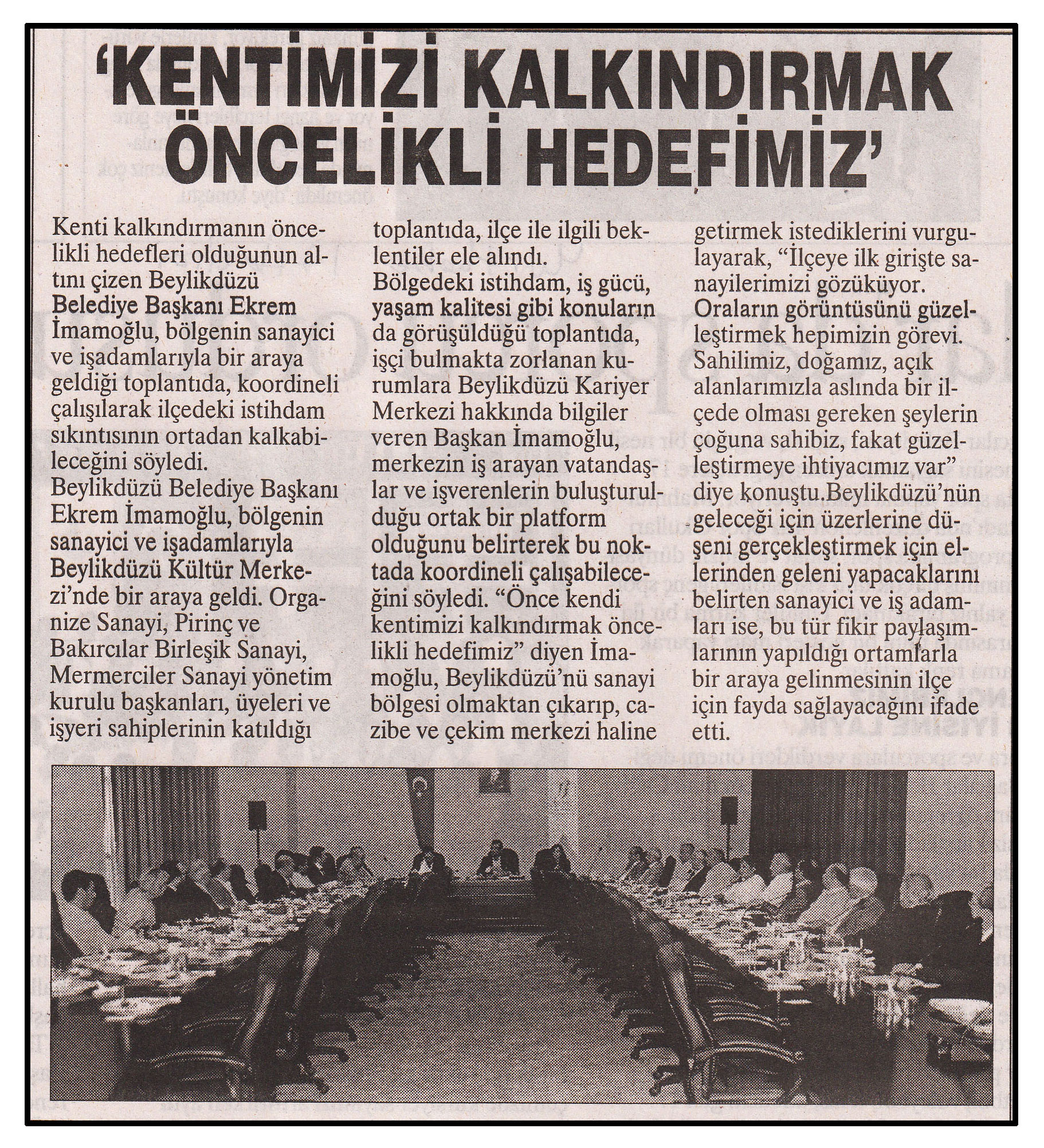17 Haziran 2014 tarihli "YURT HABER" gazetesi. Kenti kalkındırmanın öncelikli hedefleri olduğunun altını çizen Beylikdüzü Belediye Başkanı Ekrem İmamoğlu, bölgenin sanayici ve işadamlarıyla bir araya geldiği toplantıda, koordineli çalışarak ilçedeki istihdam sıkıntının ortadan kalkabileceğini söyledi.