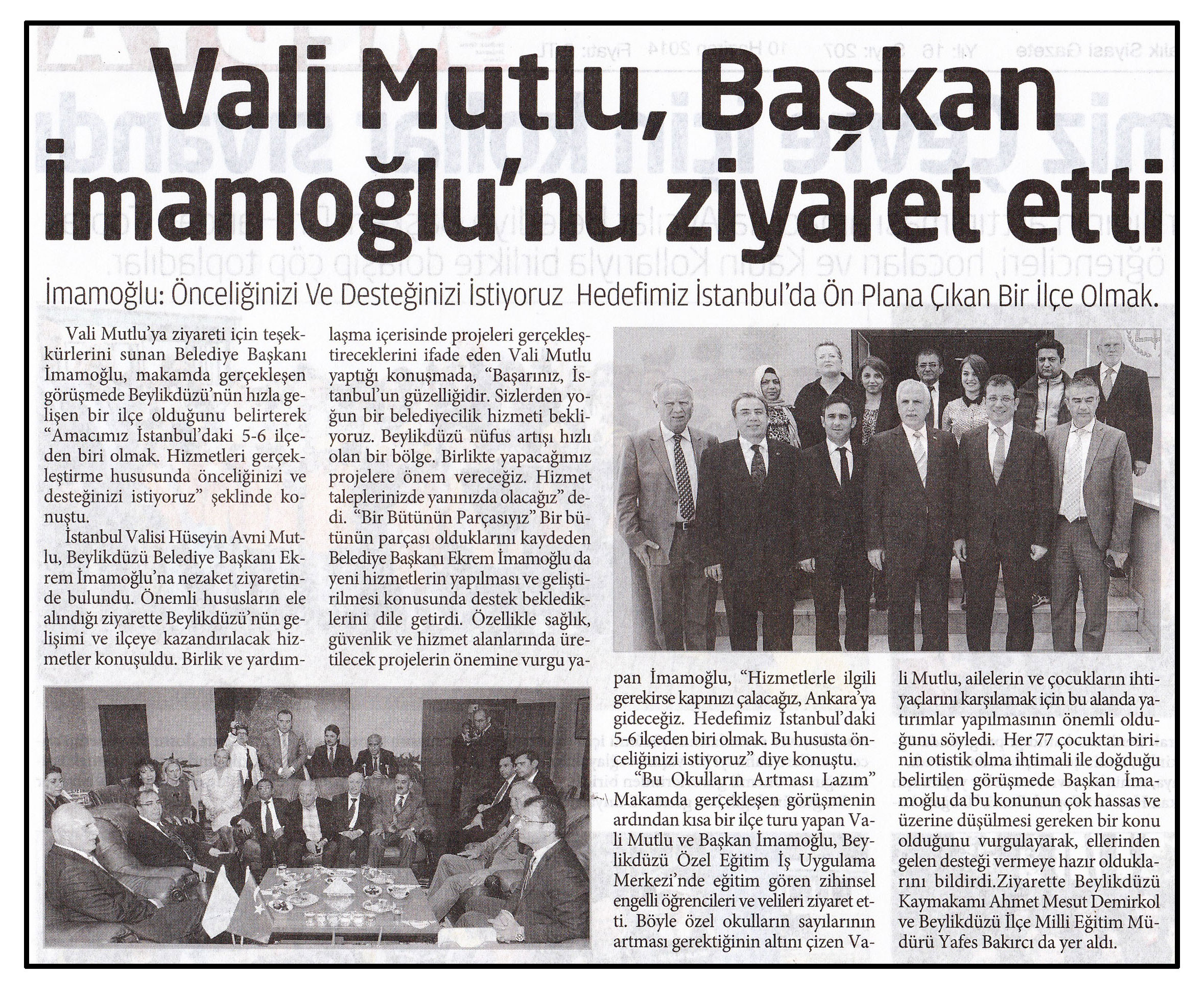 18 Haziran 2014 tarihli "YEREL MEDYA" gazetesi. Vali Mutlu'ya ziyareti için teşekkürlerini sunan Belediye Başkanı İmamoğlu, makamda gerçekleşen görüşmede Beylikdüzü'nün hızla gelişen bir ilçe olduğunu belirterek "Amacımız İstanbul'daki 5-6 ilçeden biri olmak Hizmetleri gerçekleştirme hususunda önceliğinizi ve desteğinizi istiyoruz" şeklinde konuştu.