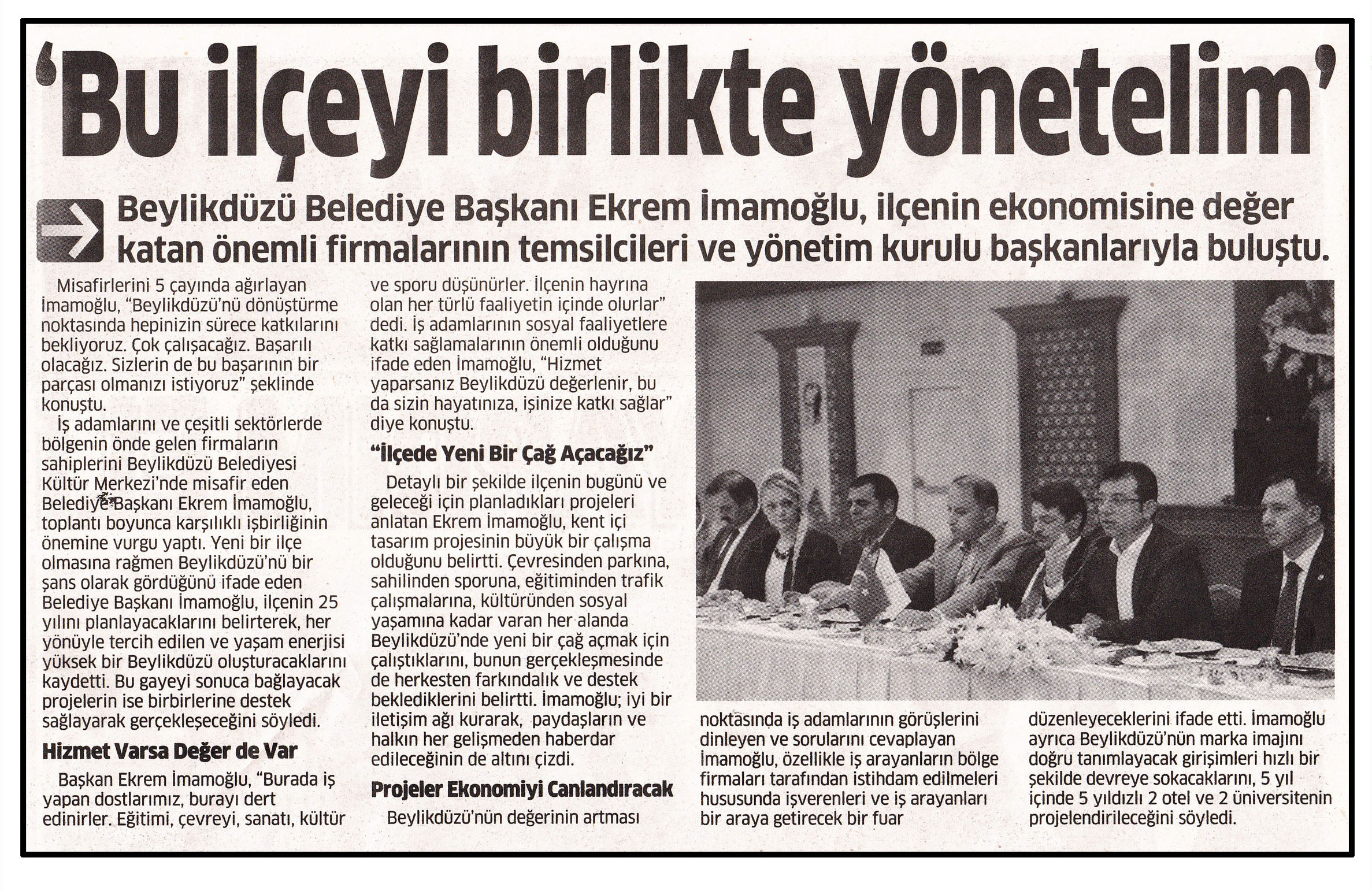 23 Haziran 2014 tarihli "ANAHTAR" gazetesi. Beylikdüzü Belediye Başkanı Ekrem İmamoğlu, ilçenin ekonomisine değer katan önemli firmalarının temsilcileri ve yönetim kurulu başkanlarıyla buluştu.