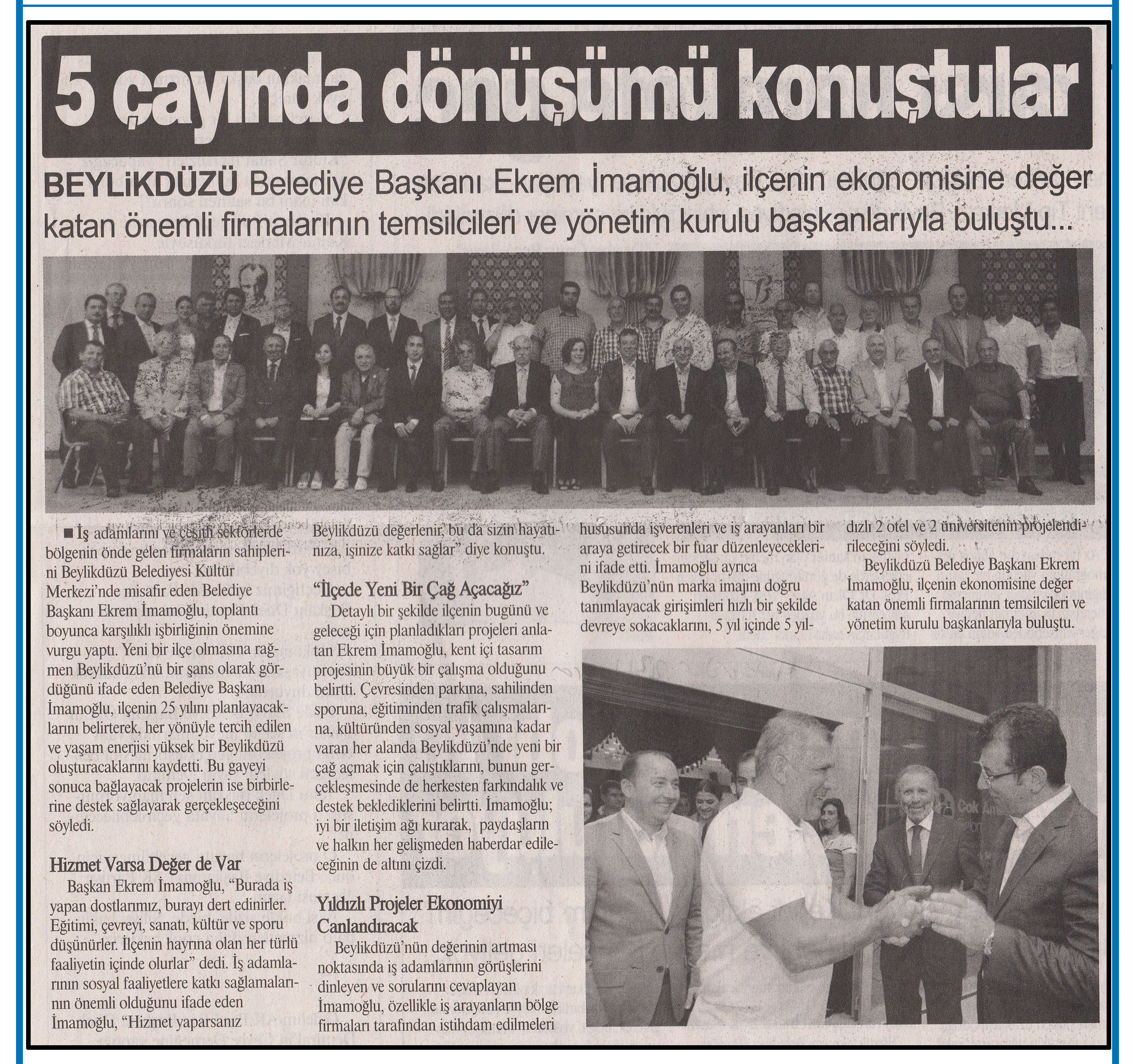 23 Haziran 2014 tarihli "HABERDAR" gazetesi. Beylikdüzü Belediye Başkanı Ekrem İmamoğlu, ilçenin ekonomisine değer katan önemli firmalarının temsilcileri ve yönetim kurulu başkanlarıyla buluştu.