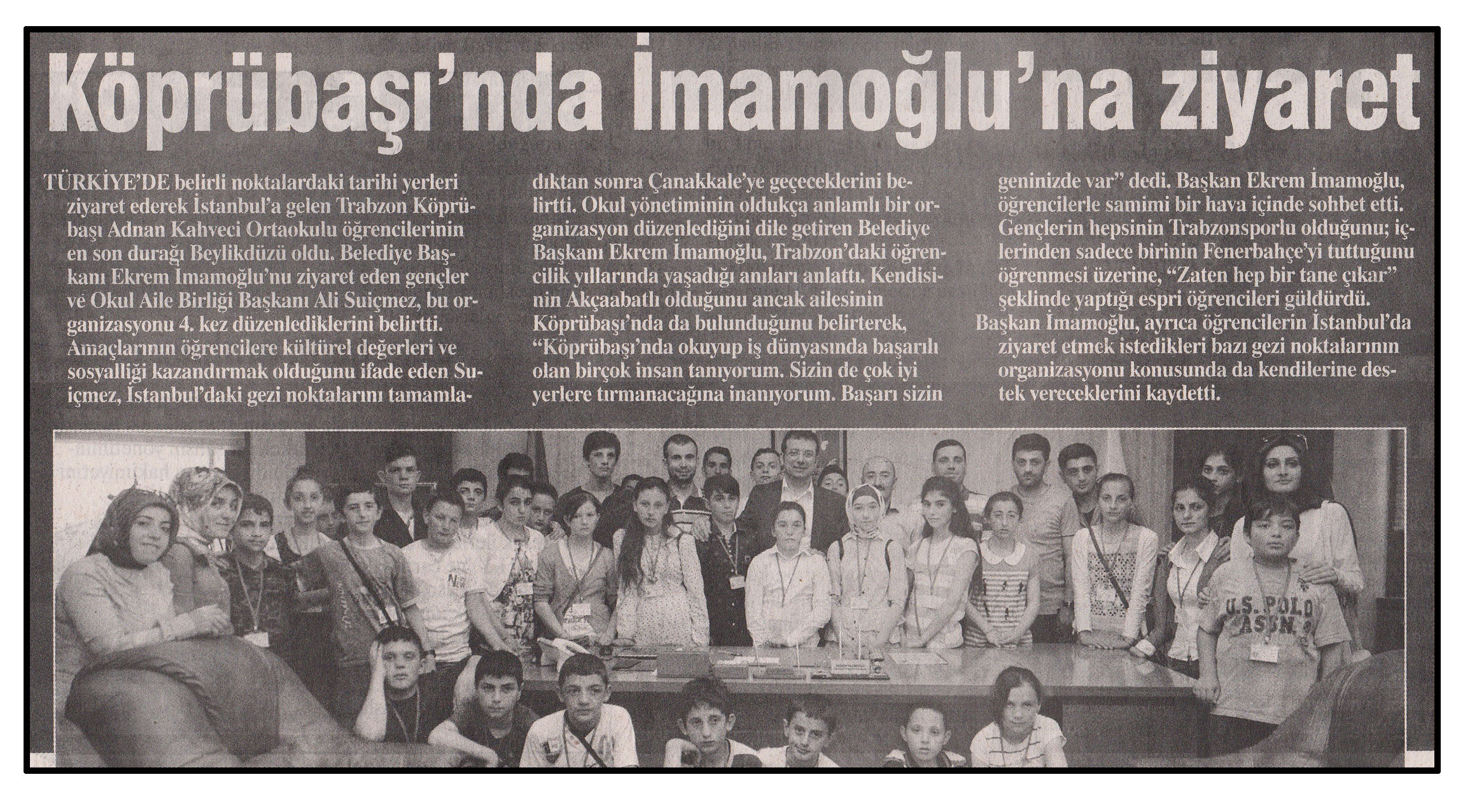 23 Haziran 2014 tarihli "YÖRÜNGE" gazetesi. Türkiye'de belirli noktalardaki tarihi yerleri ziyaret ederek İstanbul'a gelen Trabzon Köprübaşı Adnan Kahveci Ortaokulu öğrencilerinin en son durağı Beylikdüzü oldu.