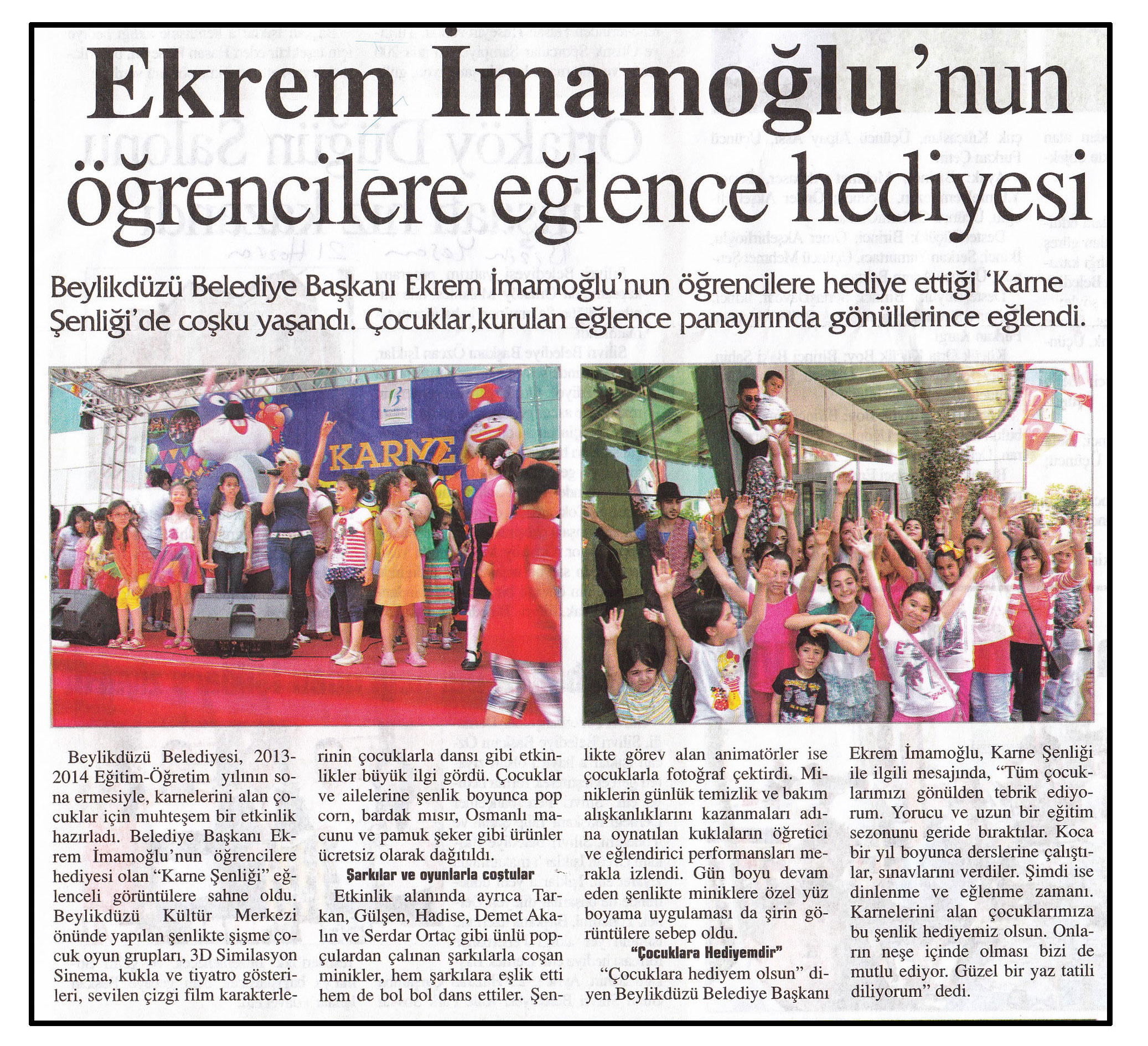 24 Haziran 2014 tarihli "BİZİMYAŞAM" gazetesi. Beylikdüzü Belediye Başkanı Ekrem İmamoğlu'nun öğrencilere hediye ettiği 'Karne Şenliği'de coşku yaşandı. Çocuklar, kurulan eğlence panayırında gönüllerince eğlendi.