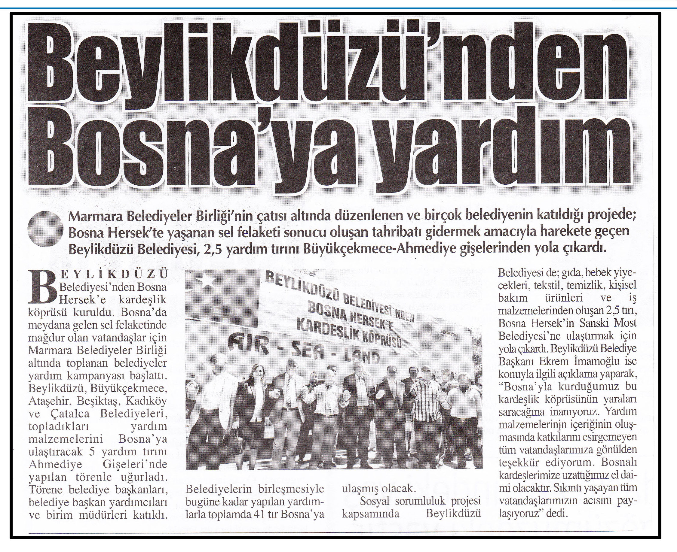 24 Haziran 2014 tarihli "HABER SON NOKTA" gazetesi. Marmara Belediyeler Birliği'nin çatısı altında düzenlenen ve birçok belediyenin katıldığı projede; Bosna Hersek'te yaşayan sel felaketi sonucu oluşan tahribatı gidermek amacıyla harekete geçen Beylikdüzü Belediyesi, 2,5 yardım tırını Büyükçekmece-Ahmediye gişelerinden yola çıkardı.