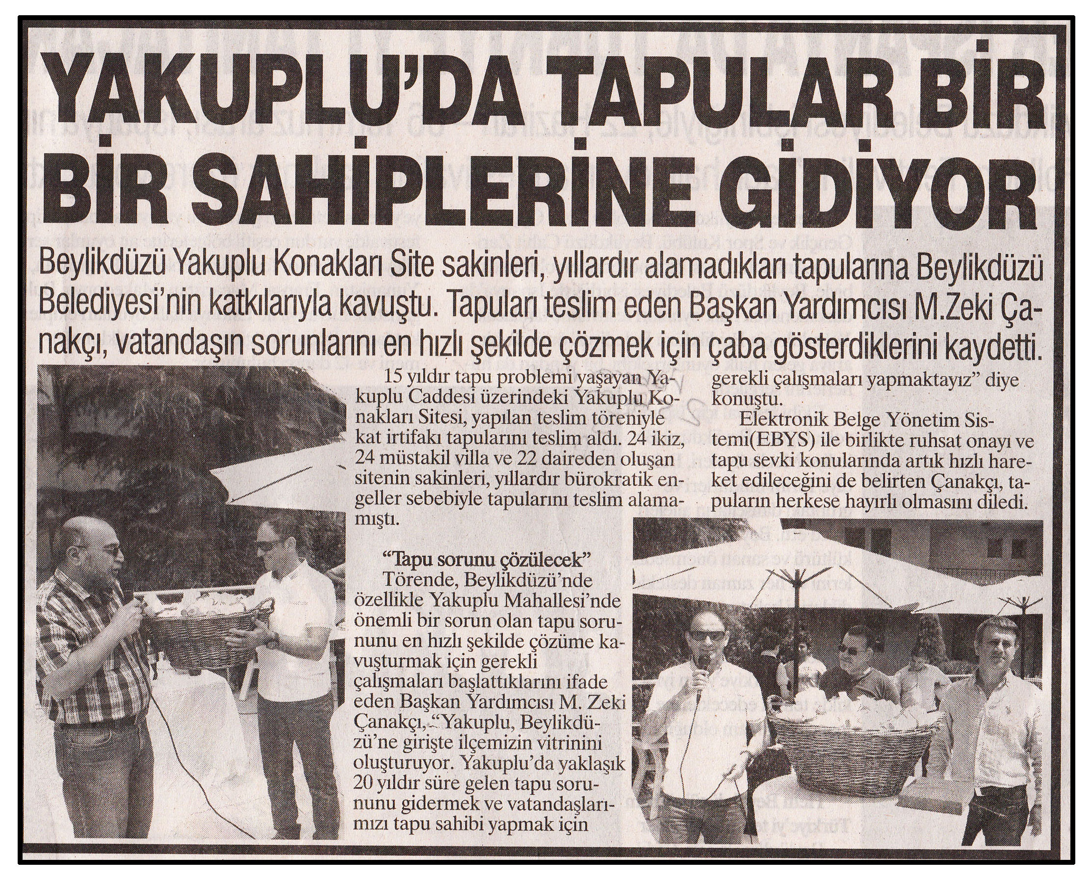 25 Haziran 2014 tarihli "HABER EKSPRESS" gazetesi. Beylikdüzü Yakuplu Konakları Site sakinleri, yıllardır alamadıkları tapularına Beylikdüzü Belediyesi'nin katkılarıyla kavuştu. Tapuları teslim eden Başkan Yardımcısı M.Zeki Çanakçı, vatandaşın sorunlarını en hızlı şekilde çözmek için çaba gösterdiklerini kaydetti.