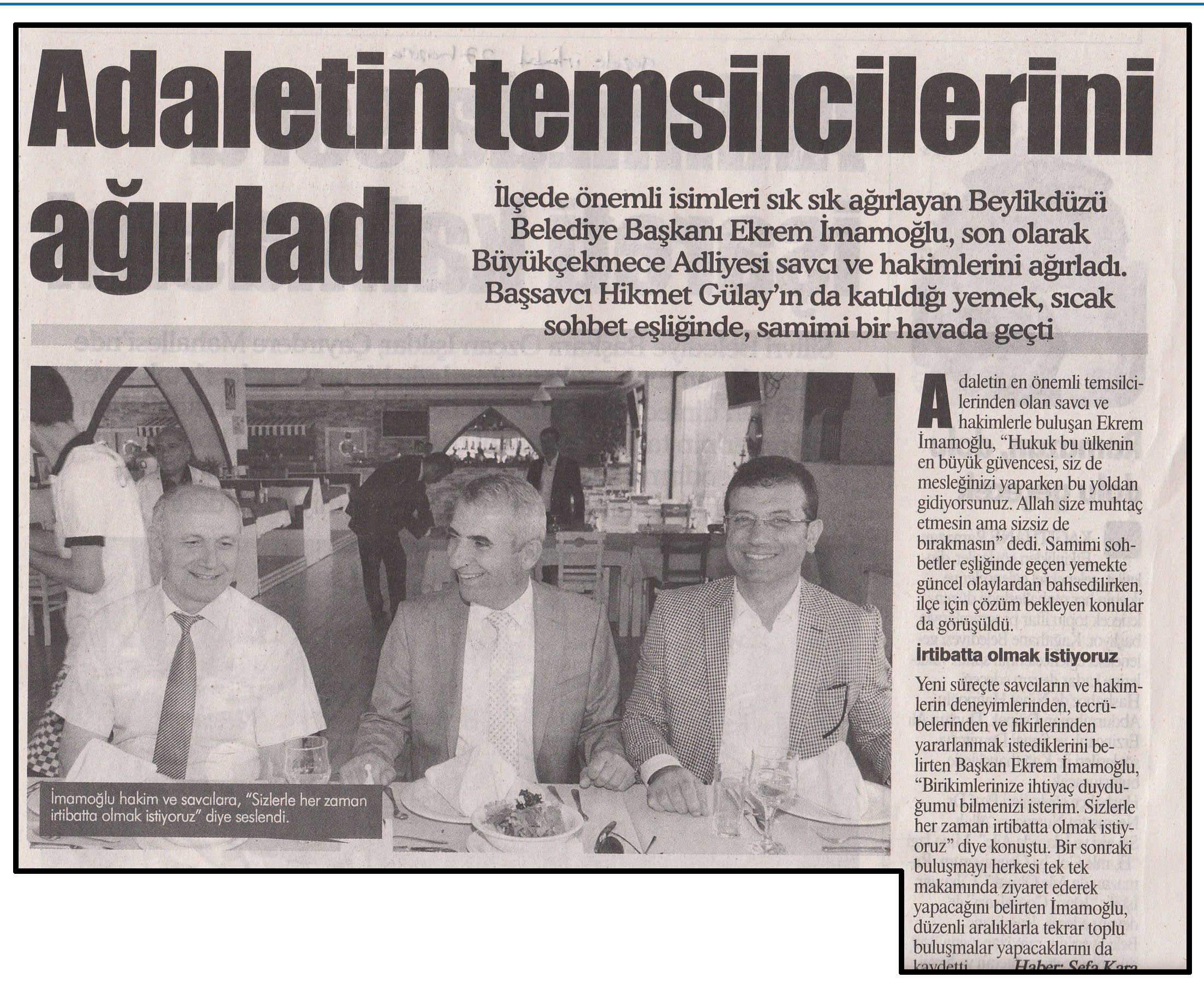 27 Haziran 2014 tarihli "GAZETE İSTANBUL" gazetesi. lçede önemli isimleri sık sık ağırlayan Beylikdüzü Belediye Başkanı Ekrem İmamoğlu, son olarak Büyükçekmece Adliyesi savcı ve hakimlerini ağırladı. Başsavcı Hikmet Gülay'ıın da katıldığı yemek, sıcak sohbet eşliğinde, samimi bir havada geçti.