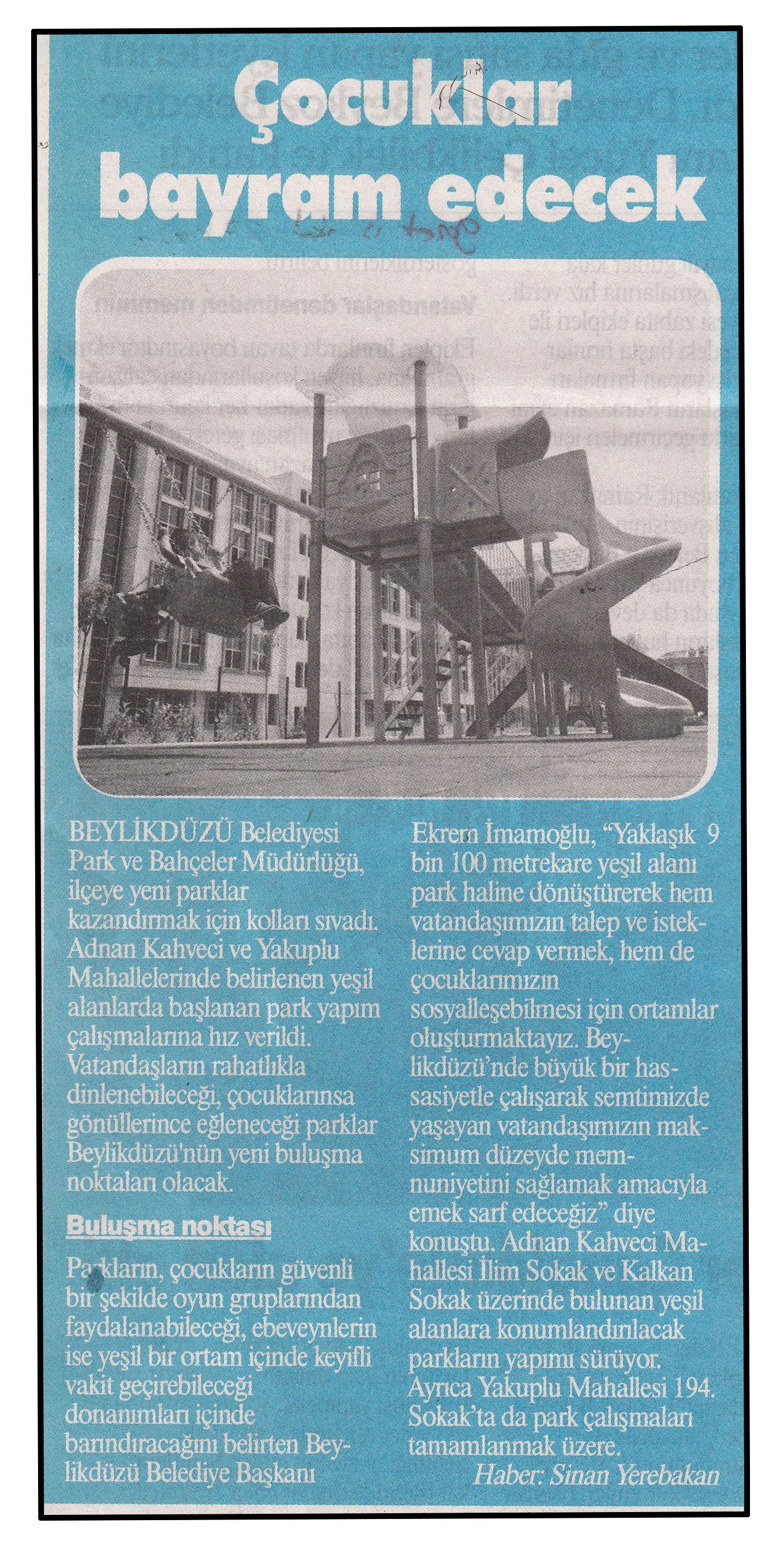 27 Haziran 2014 tarihli "GAZETE İSTANBUL" gazetesi. Beylikdüzü Belediyesi Park ve Bahçeler Müdürlüğü, ilçeye yeni parklar kazandırmak için kolları sıvadı. Adnan Kahveci ve Yakuplu Mahalelerinde belirlenen yeşil alanlarda başlanan park yapım çalışmalarına hız verildi.