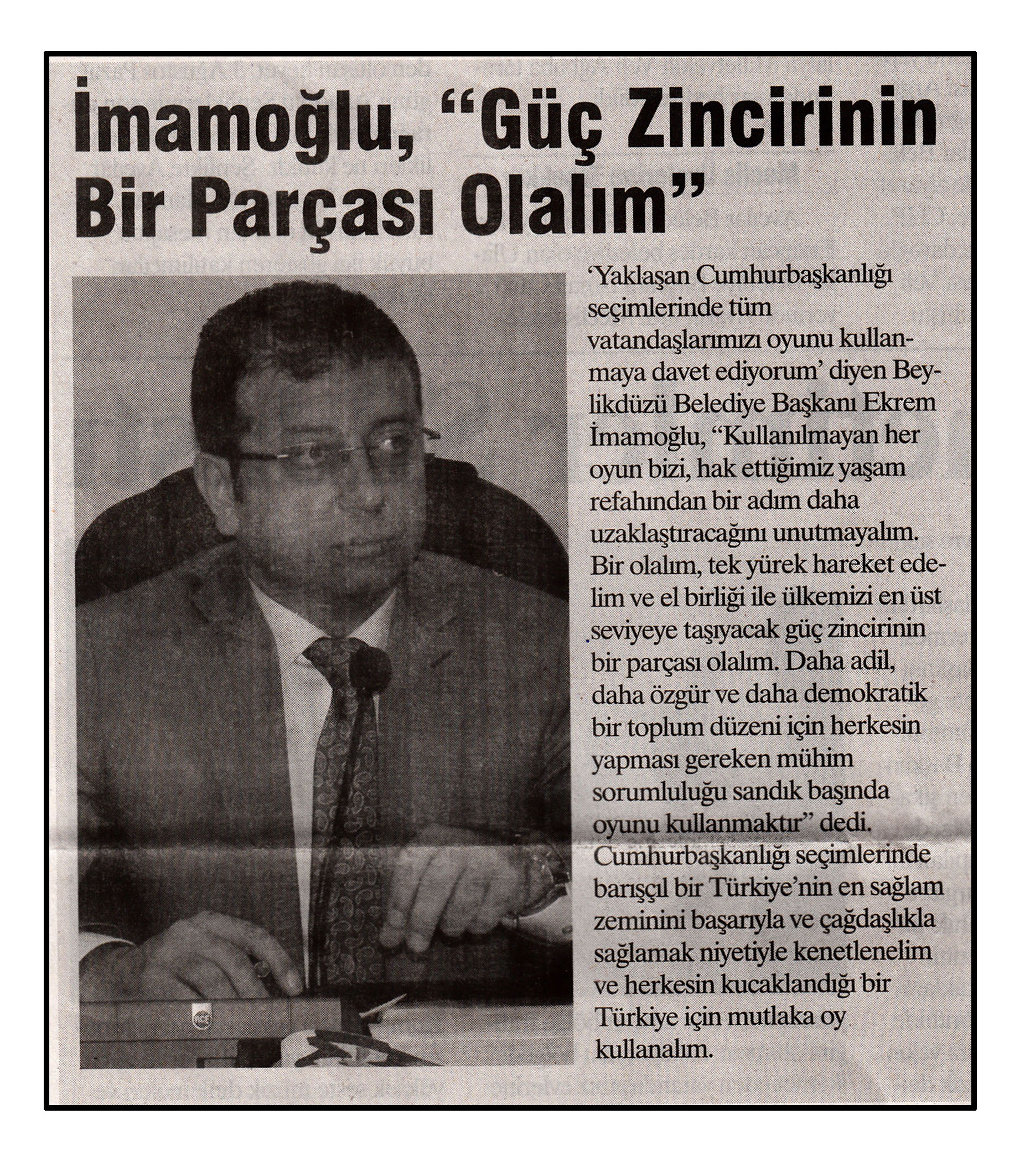 7 Ağustos 2014 tarihli ''KENT GÜNDEM'' gazetesi. ''Yaklaşan cumhurbaşkanlığı seçimlerinde tüm vatandaşlarımızı oyunu kullanmaya davet ediyorum'' diyen Beylikdüzü Belediye Başkanı Ekrem İmamoğlu ''Kullanılmayan her oyun bizi, hak ettiğimiz yaşam refahından bir adım daha uzaklaştıracağını unutmayalım.