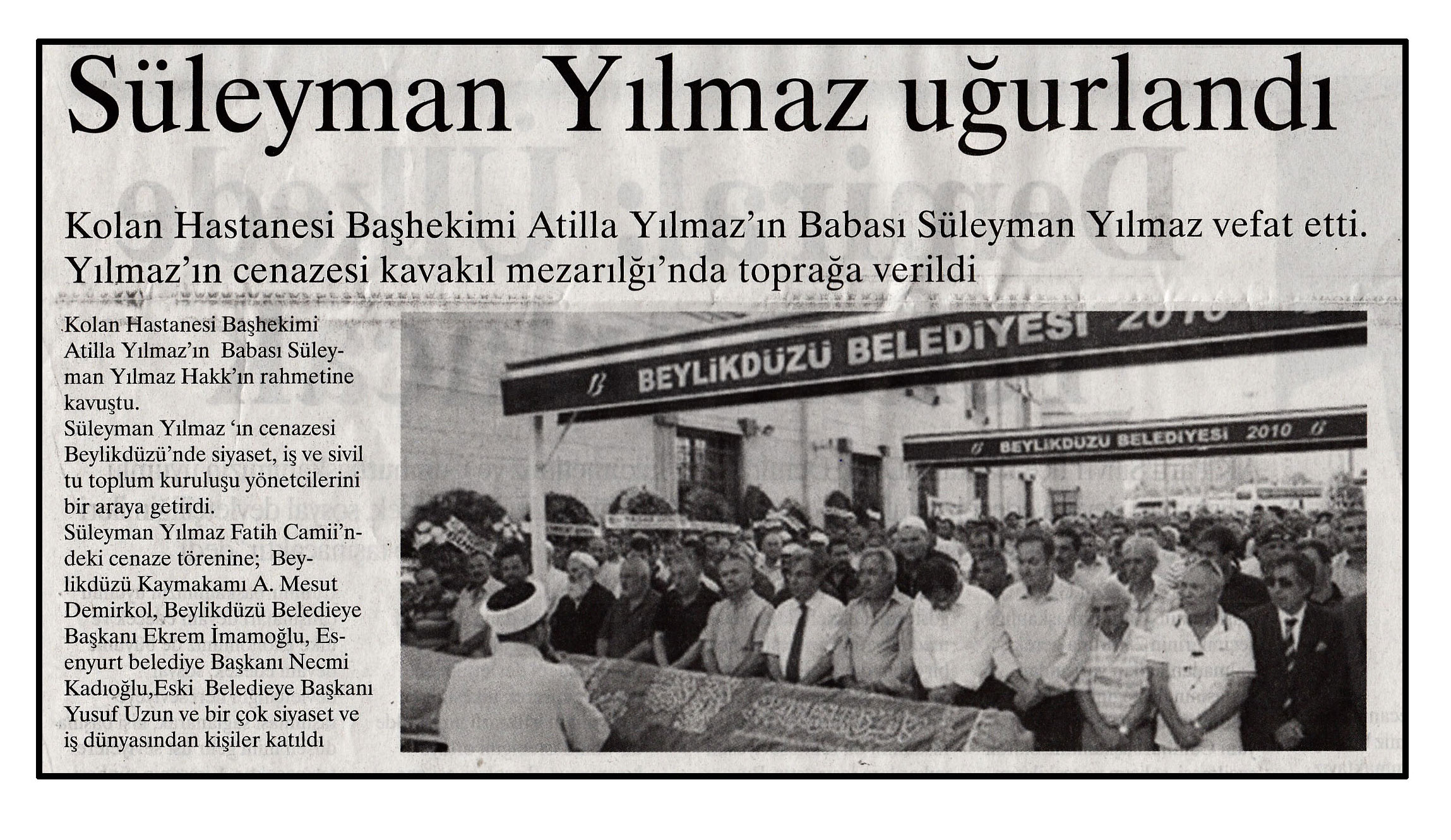 12 Ağustos 2014 tarihli ''FARK GAZETESİ'' gazetesi. Kolan Hastanesi Başhekimi Atilla Yılmaz'ın babası Süleyman Yılmaz vefat etti. Yılmaz'ın cenazesi Kavaklı Mezarlığı'nda toprağa verildi.