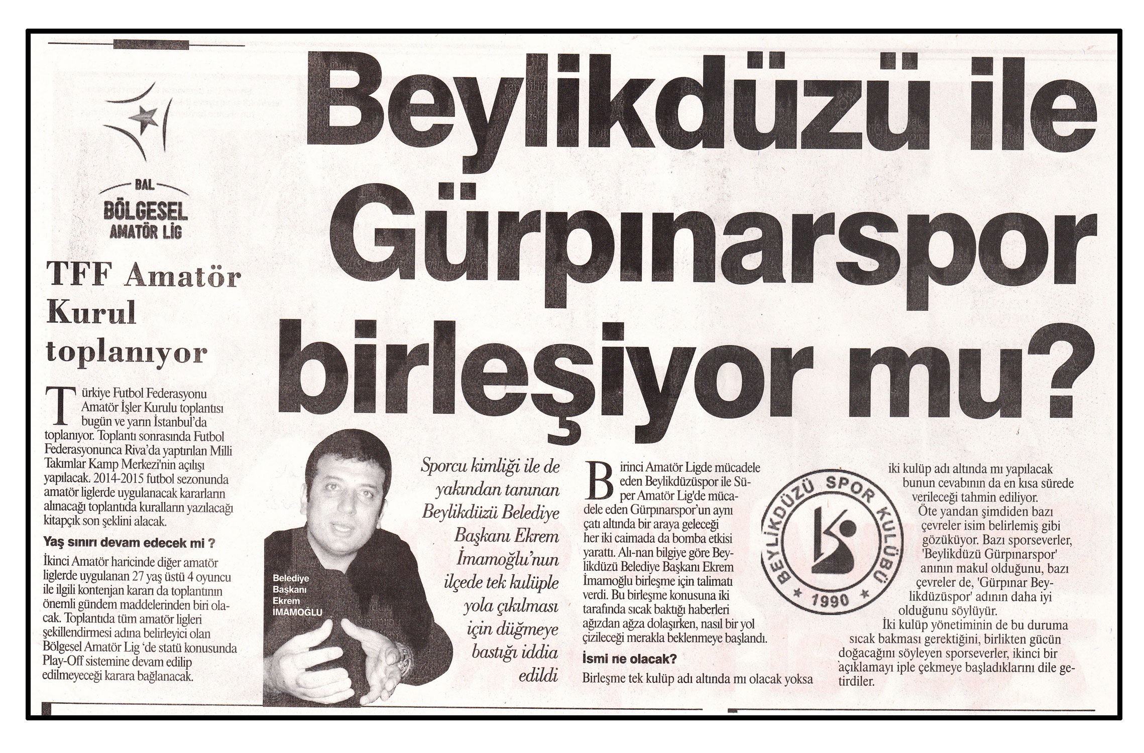 4 Temmuz 2014 tarihli "GERÇEK" gazetesi. Birinci Amatör Ligde mücadele eden Beylikdüzüspor ile Süper Amatör Lig'de mücadele eden Gürpınarspor'un aynı çatı altında bir araya geleceği er iki camiada da bomba etkisi yarattı.