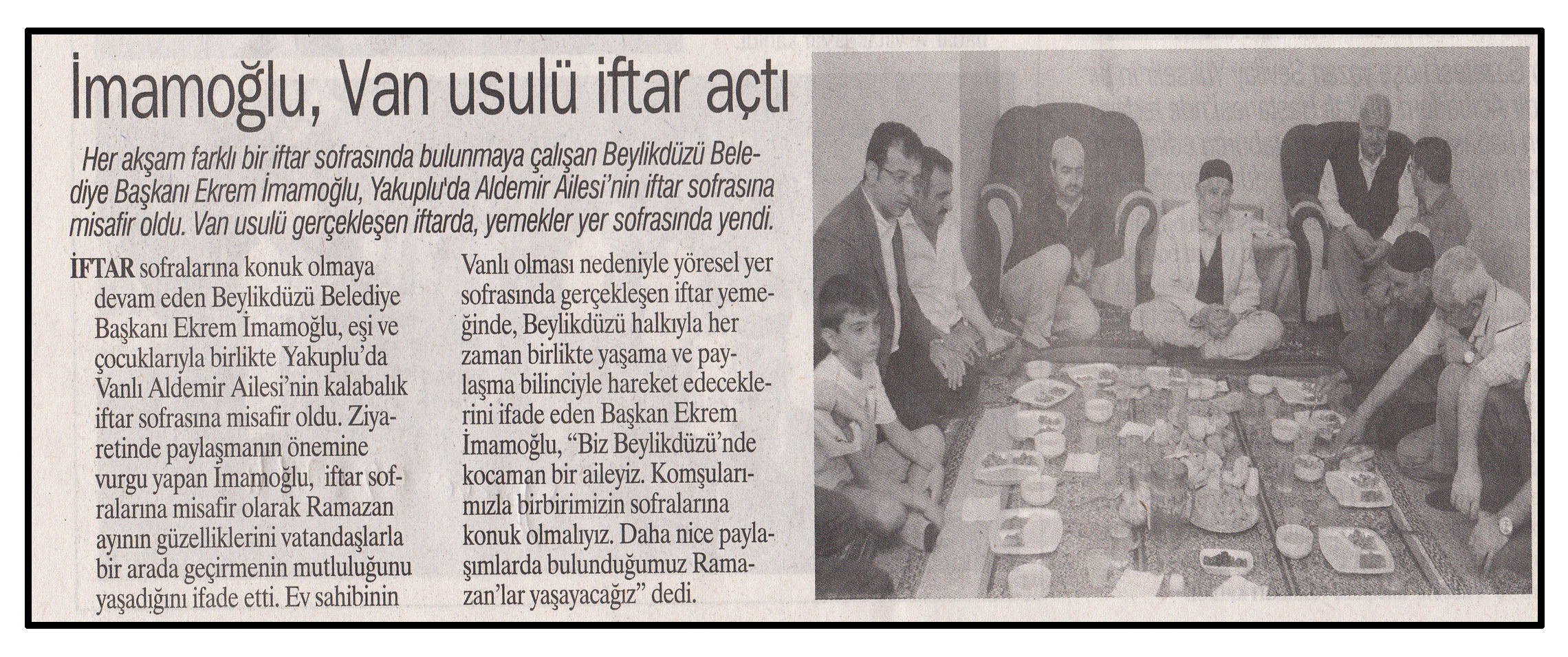 9 Temmuz 2014 tarihli "YÖRÜNGE" gazetesi. Her akşam farklı bir iftar sofrasında bulunmaya çalışan Beylikdüzü Belediye Başanı Ekrem İmamoğlu, Yakuplu'da Aldemir Ailesi'nin iftar sofrasına misafir oldu. Van usulü gerçekleşen iftarda, yemekler yer sofrasında yendi.