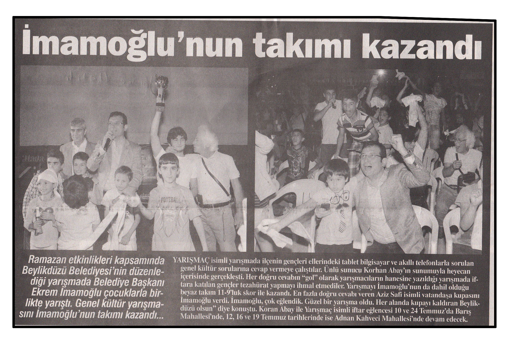 11 Temmuz 2014 tarihli "YÖRÜNGE" gazetesi. Ramazan etkinlikleri kapsamında Beyikdüzü Belediyesi'nin düzenlediği yarışmada Belediye Başkanı Ekrem İmamoğlu çocuklarla birlikte yarıştı. Genel kültür yarışmasını İmamoğlu'nun takımı kazandı.