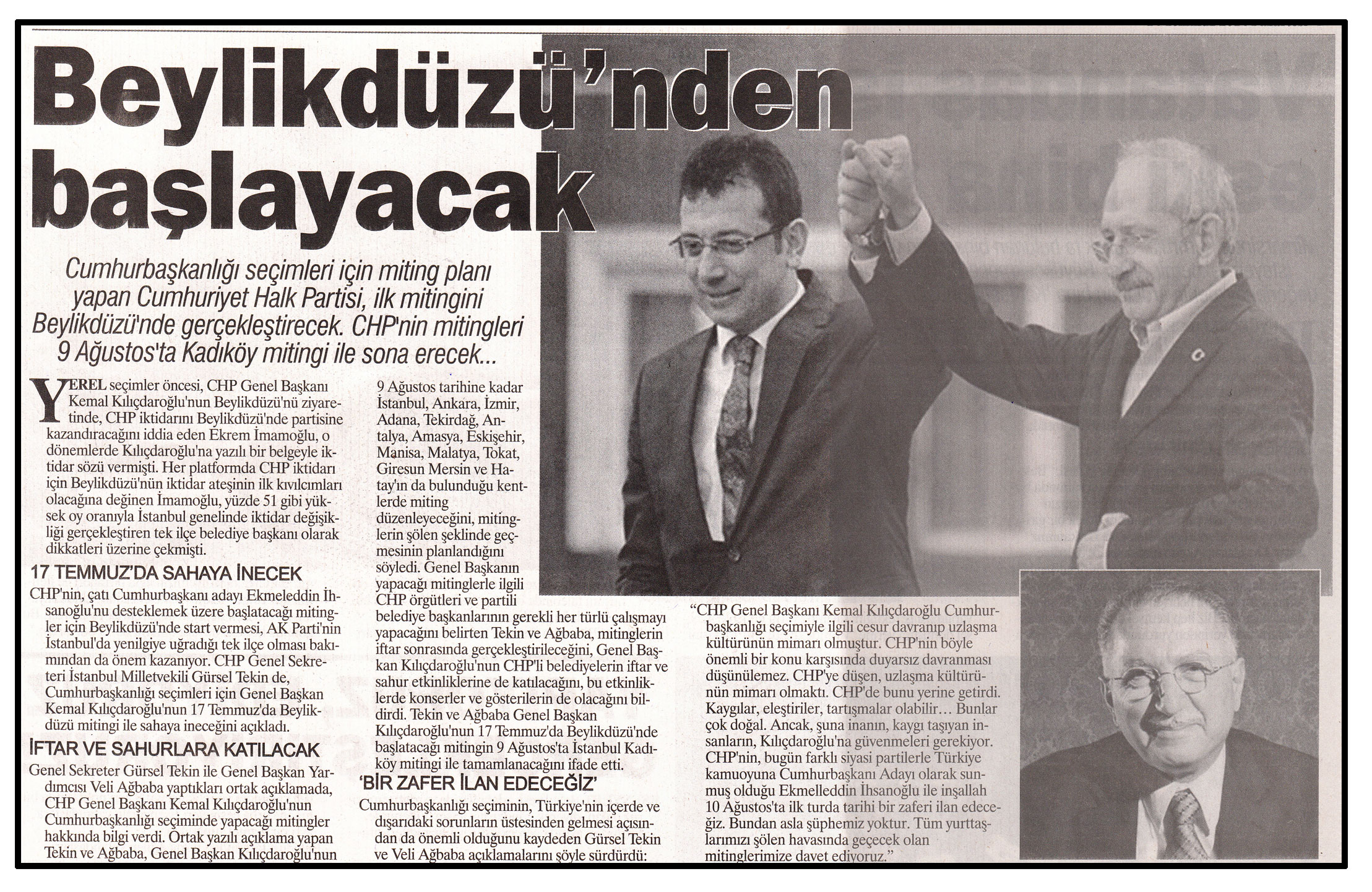 14 Temmu 2014 tarihli "YÖRÜNGE" gazetesi. Cumhurbaşkanlığı seçimleri için miting planı yapan Cumhuriyet Halk Partii, ilk mitingini Beylikdüzü'nde gerçekleştirecek. CHP'nin mitingleri 9 Ağustos'ta Kadıköy mitingi ile sona erecek.