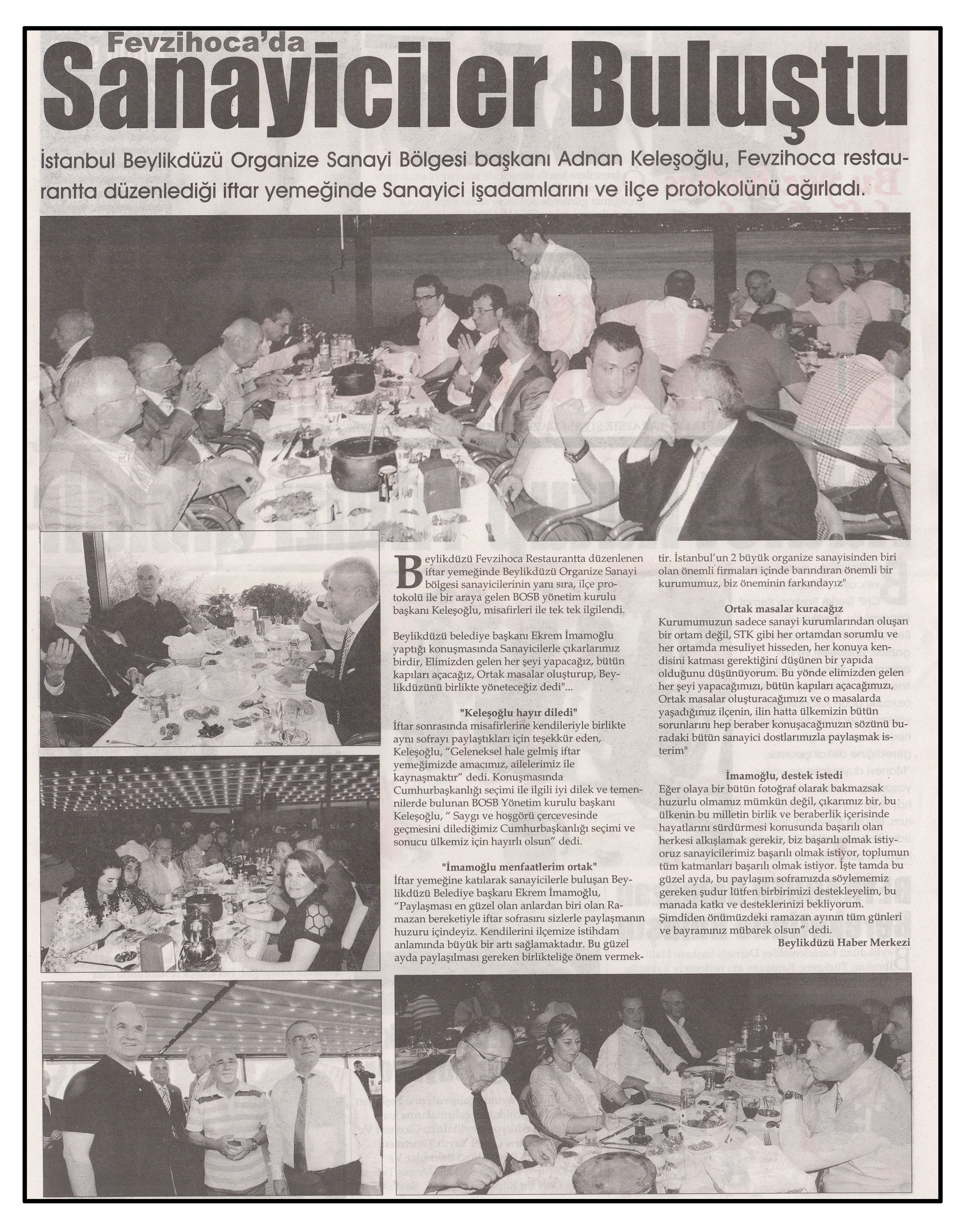 22 Temmuz 2014 tarihli "BEYLİKDÜZÜ" gazetesi. İstanbul Beylikdüzü Organize Sanayi Bölgesi başkanı Adnan Keleşoğlu, Fevzihoca restaurantta düzenlediği iftar yemeğinde Sanayici işadamlarını ve ilçe protokolünü ağırladı.