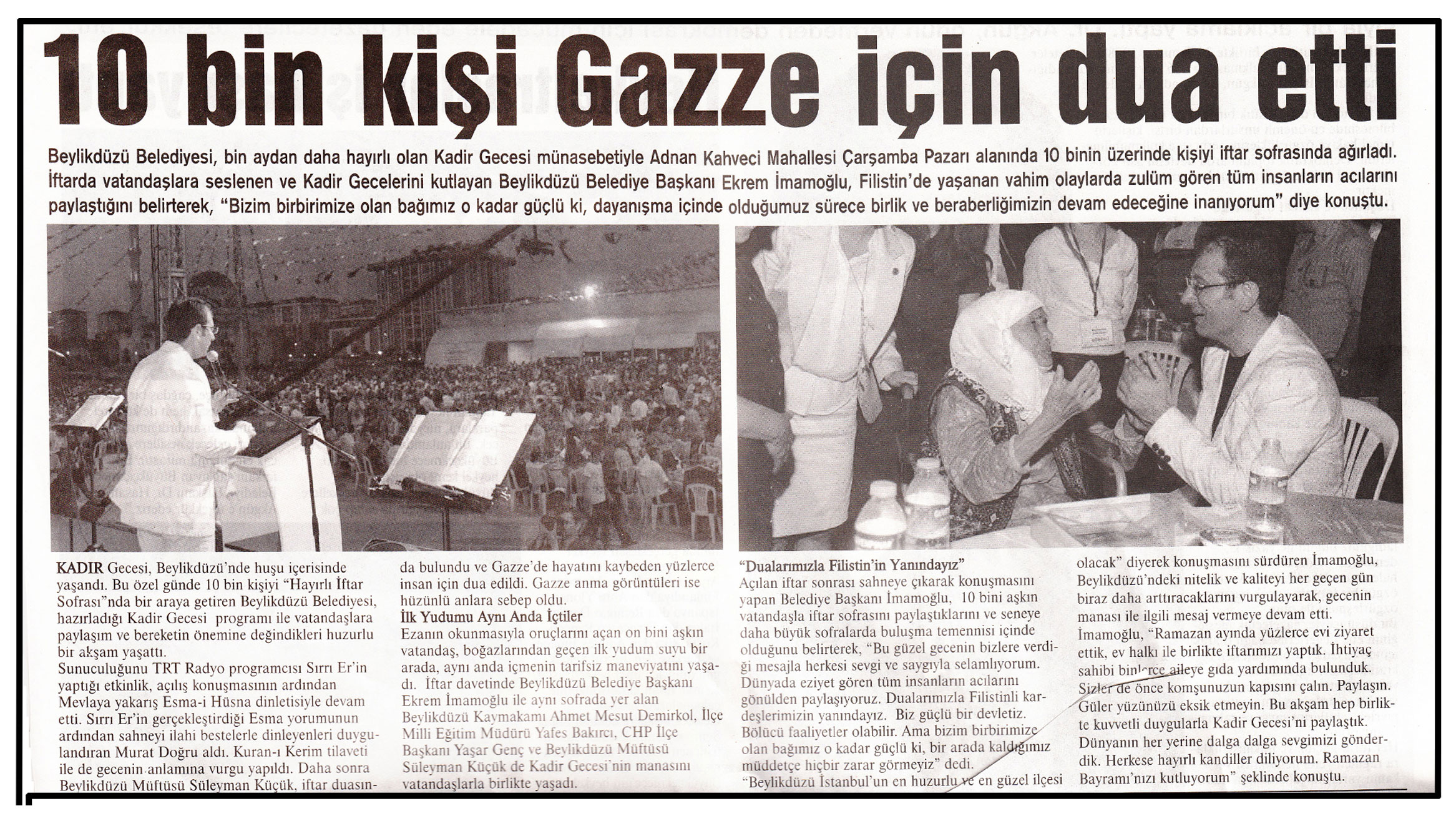 25 Temmuz 2014 tarihli "MARMARA" gazetesi. Beylikdüzü Belediyesi, bin aydan daha hayırlı olan Kadir Gecesi münasebetiyle Adnan Kahveci Mahalllesi Çarşamba Pazarı alanında 10 binin üzerinde kişiyi iftar sofrasında ağırladı.