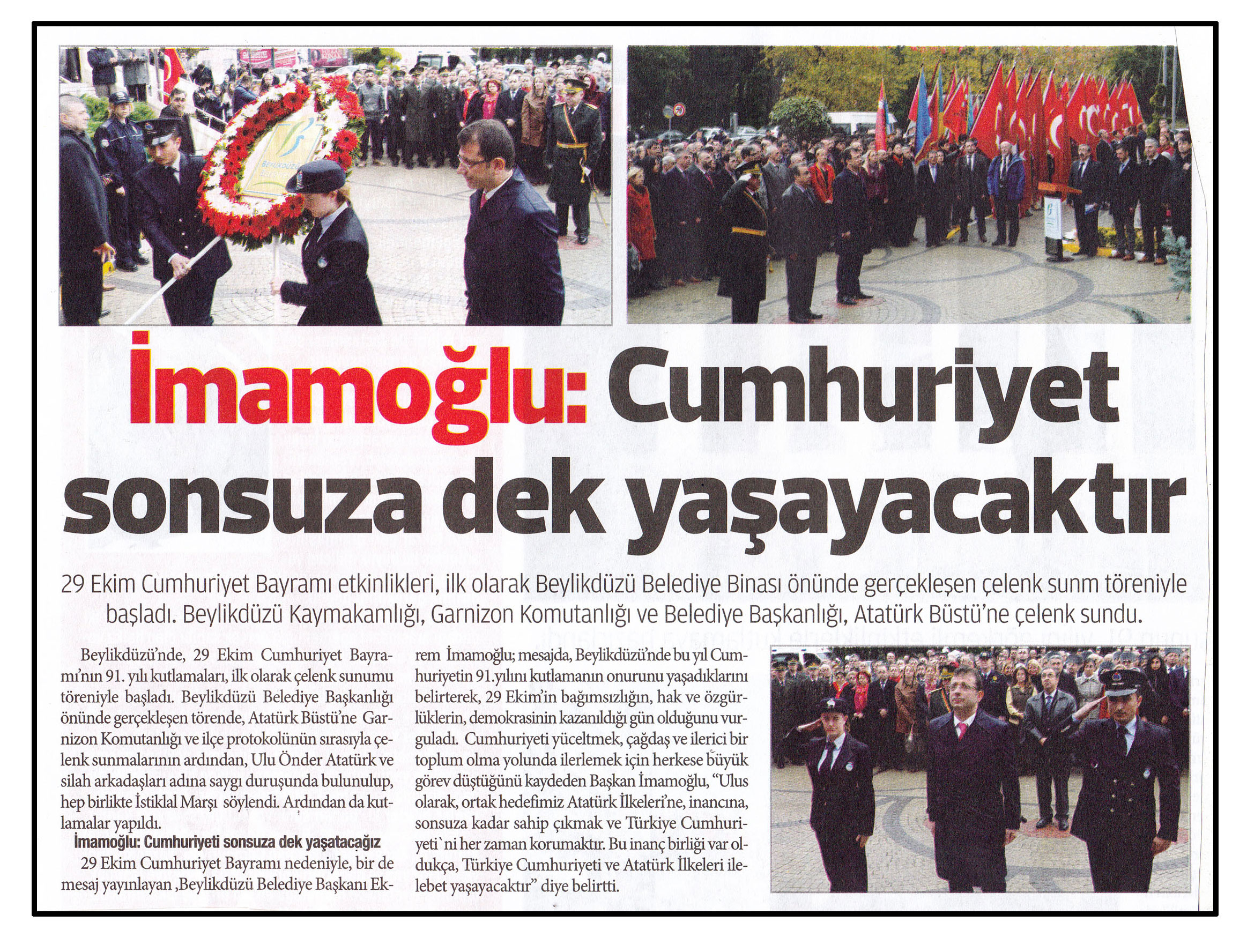 3 Kasım 2014 tarihli "BİZİMYAŞAM" gazetesi. 29 Ekim Cumhuriyet Bayramı etkinlikleri, ilk olarak Beylikdüzü Belediye Binası önünde gerçekleşen çelenk sunum töreniyle başladı. Beylikdüzü Kaymakamlığı, Garnizon Komutanlığı ve Belediye Başkanlığı, Atatürk Büstü'ne çelenk sundu.