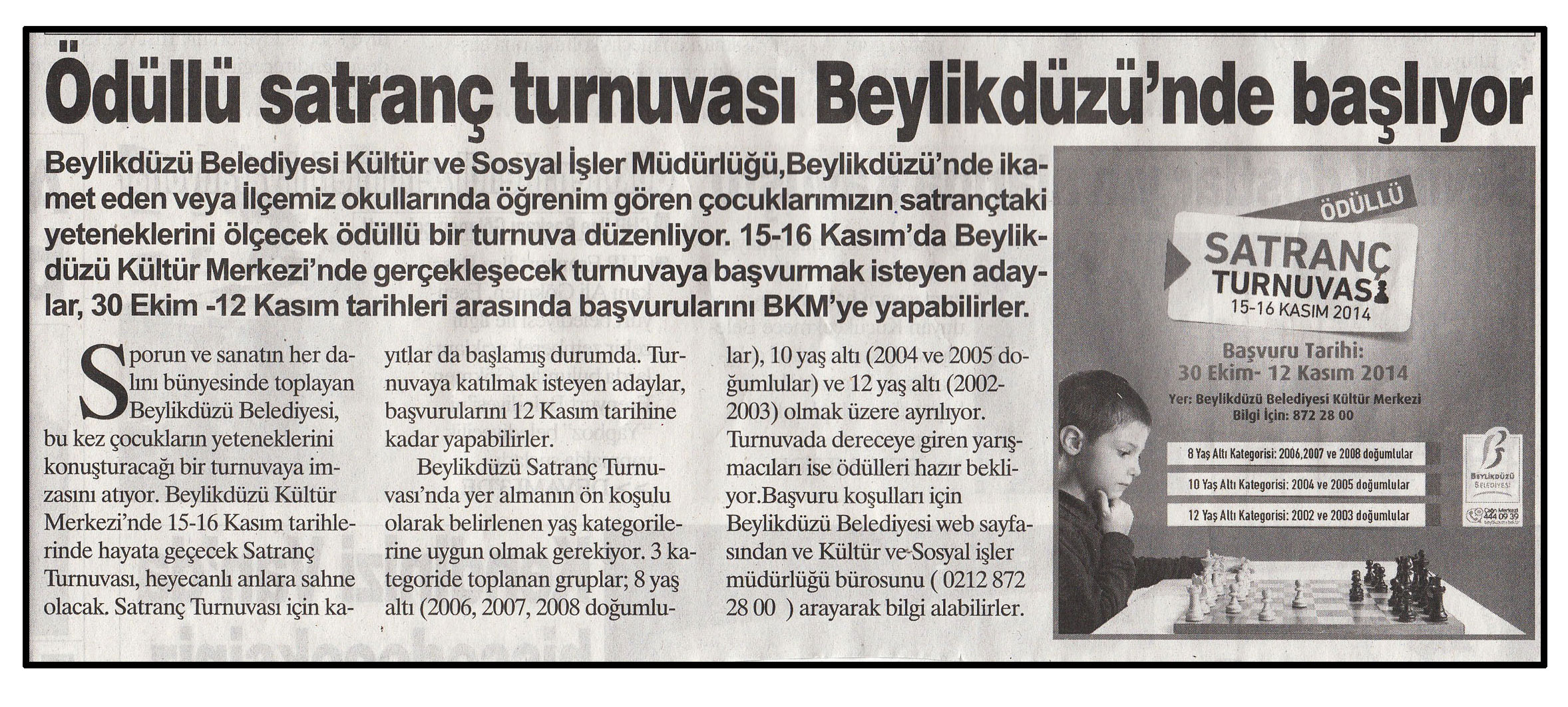 3 Kasım 2014 tarihli "HABER EKSPRES" gazetesi. Beylikdüzü Belediyesi Kültür ve Sosyal İşler Müdürlüğü, Beylikdüzü'nde ikamet eden veya İlçemiz okullarında öğrenim gören çocuklarımızın satrançtaki yeteneklerini ölçecek ödüllü bir turnuva düzenliyor.