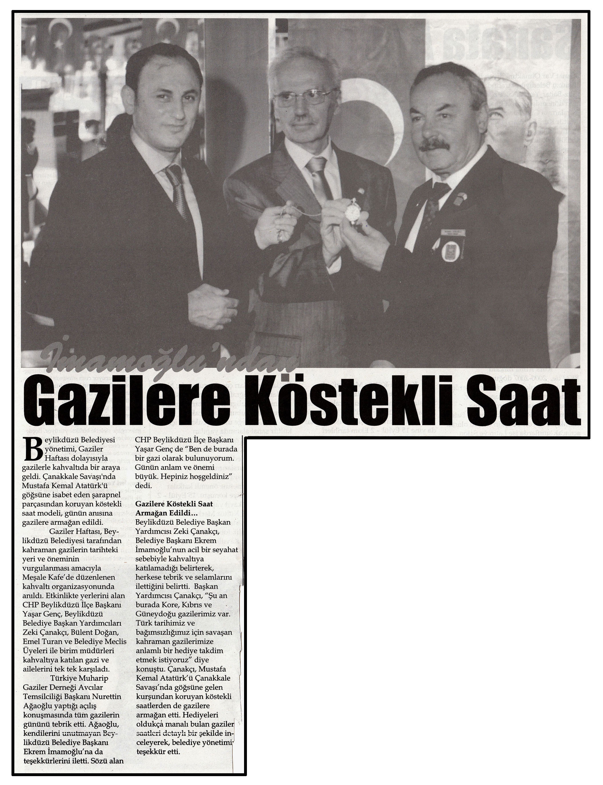 8 Ekim 2014 tarihli ''BEYLİKDÜZÜ'' gazetesi. Beylikdüzü Belediyesi yönetimi, Gaziler Haftası dolayısıyla gazilerle kahvaltıda bir araya geldi. Çanakkale Savaşı'nda Mustafa Kemal Atatürk'ü göğsüne isabet eden şarapnel parçasından koruyan köstekli saat modeli, günün anısına gazilere armağan edildi.