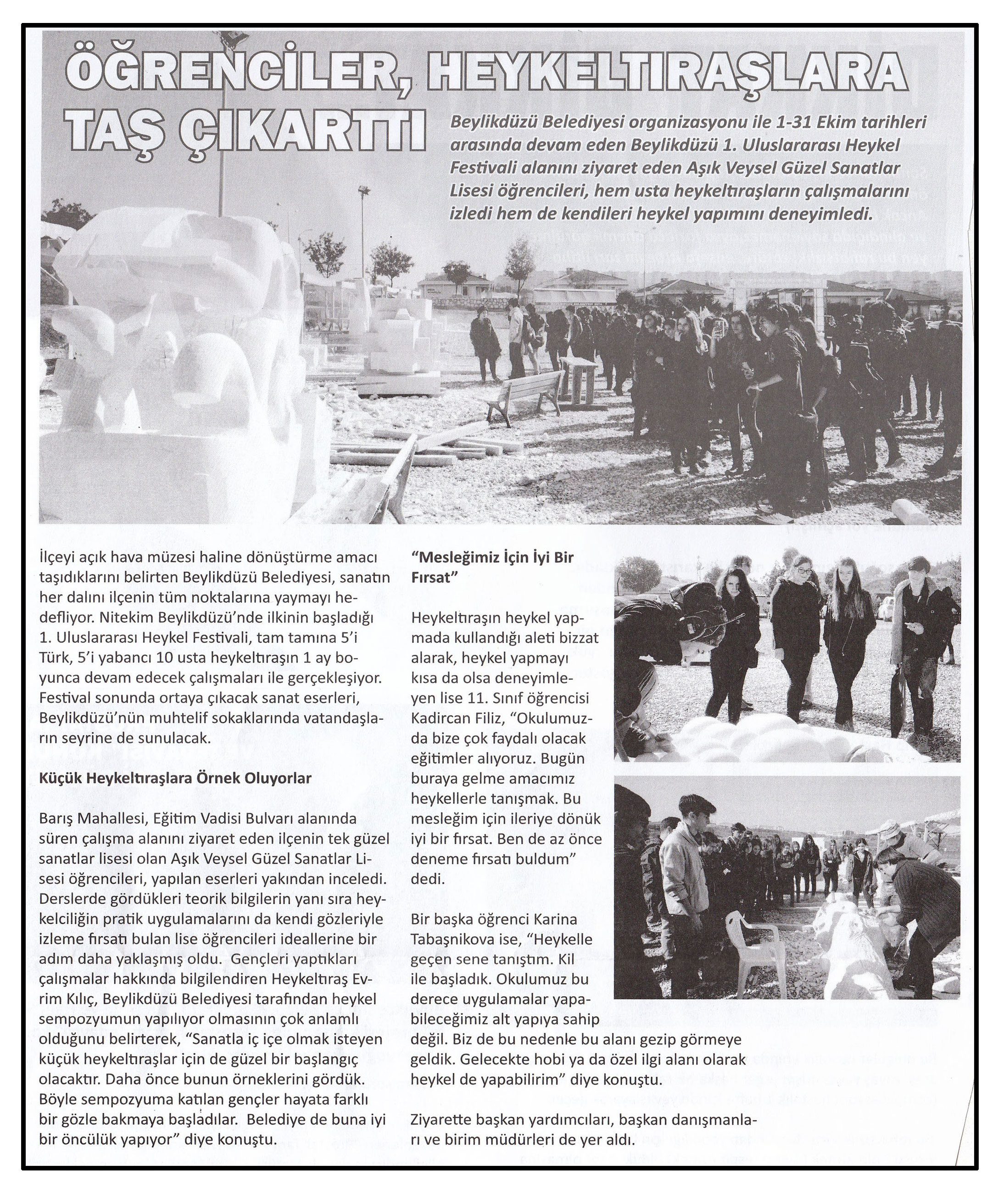3 Kasım 2014 tarihli "HABER POZİTİF" gazetesi. Beylikdüzü Belediyesi organizsyonu ile 1-31 Ekim tarihleri arasında devam eden Beylikdüzü 1. Uluslararası Heykel Festivali alanını ziyaret eden Aşık Veysel Güzel Sanatlar Lisesi öğrencileri, hem usta heykeltıraşların çalışmalarını izledi hem de kendileri heykel yapımını deneyimledi.