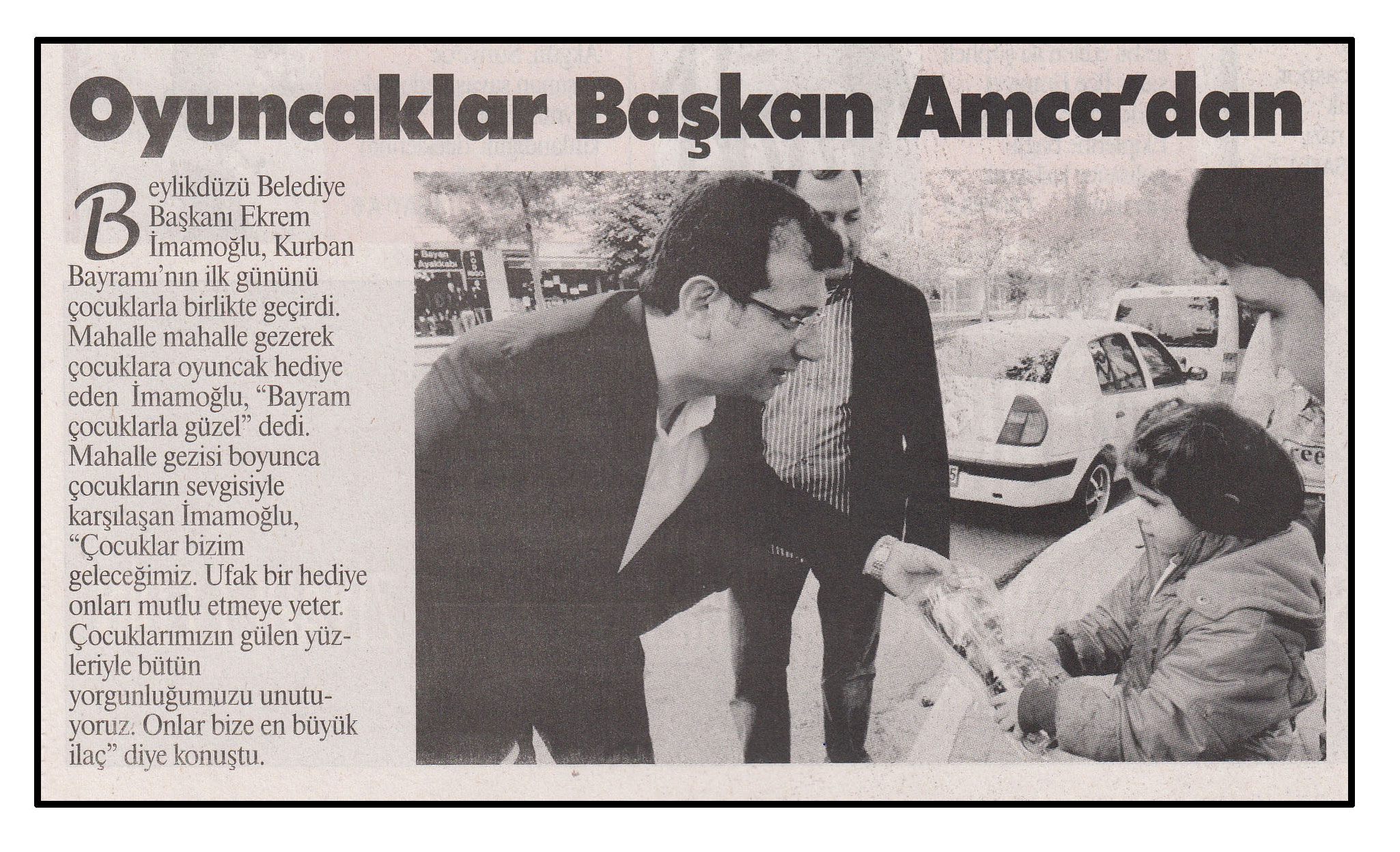 8 Ekim 2014 tarihli ''GERÇEKGAZETESİ'' gazetesi. Beylikdüzü Belediye Başkanı Ekrem İmamoğlu, Kurban Bayramı'nın ilk gününü çocuklarla geçirdi. Mahalle Mahalle gezerek çocuklara oyuncak hediye etti.
