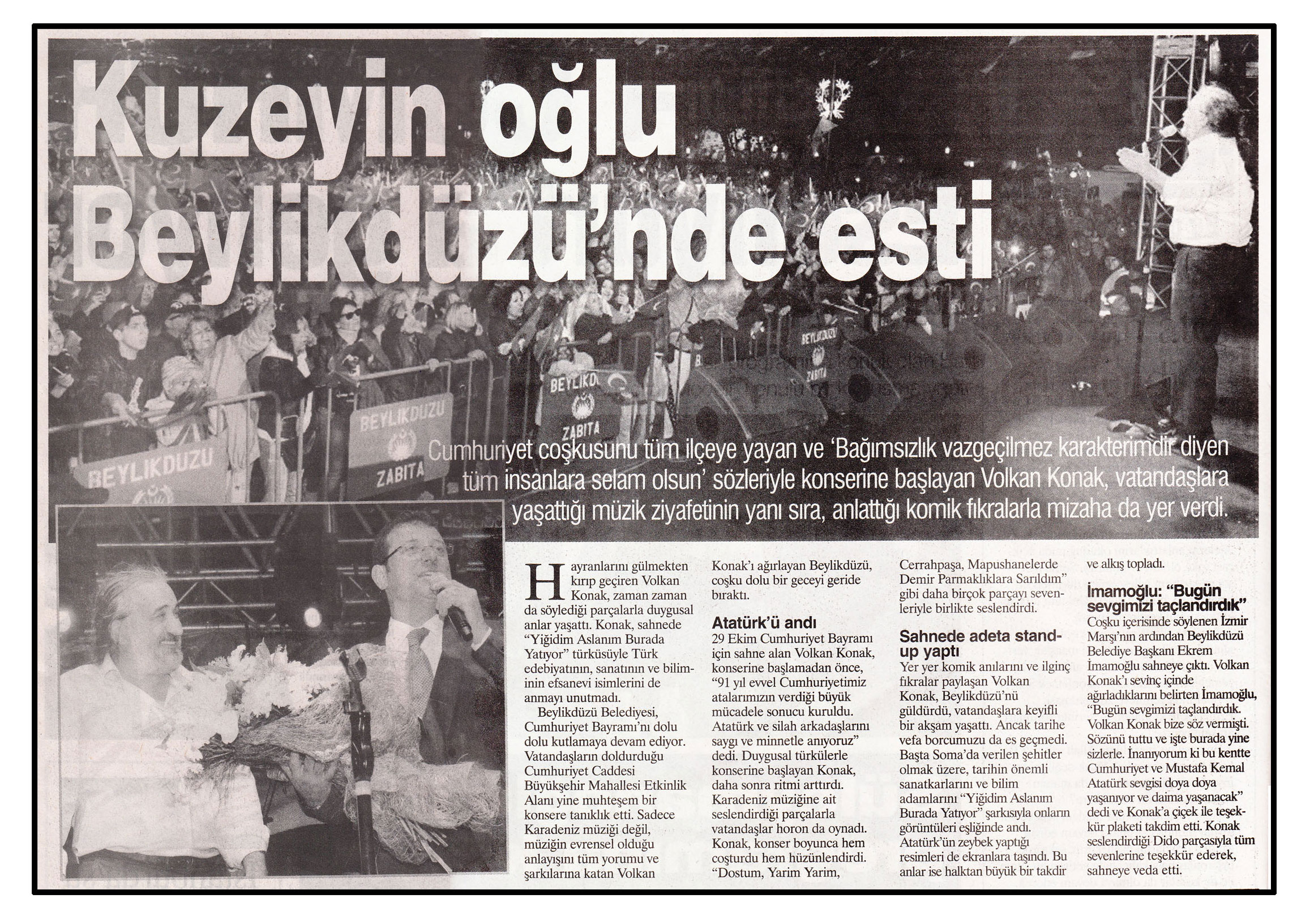 5 Kasım 2014 tarihli "KENTHABER" gazetesi. Cumhuriyet coşkusunu tüm ilçeye yayan ve 'Bağımsızlık vazgeçilmez karakterimdir diyen tüm insanlara selam olsun' sözleriyle konserine başlayan Volkan Konak, vatandaşlara yaşattığı müzik ziyafetinin yanı sıra, anlattığı komik fıkralarla mizaha da yer verildi.