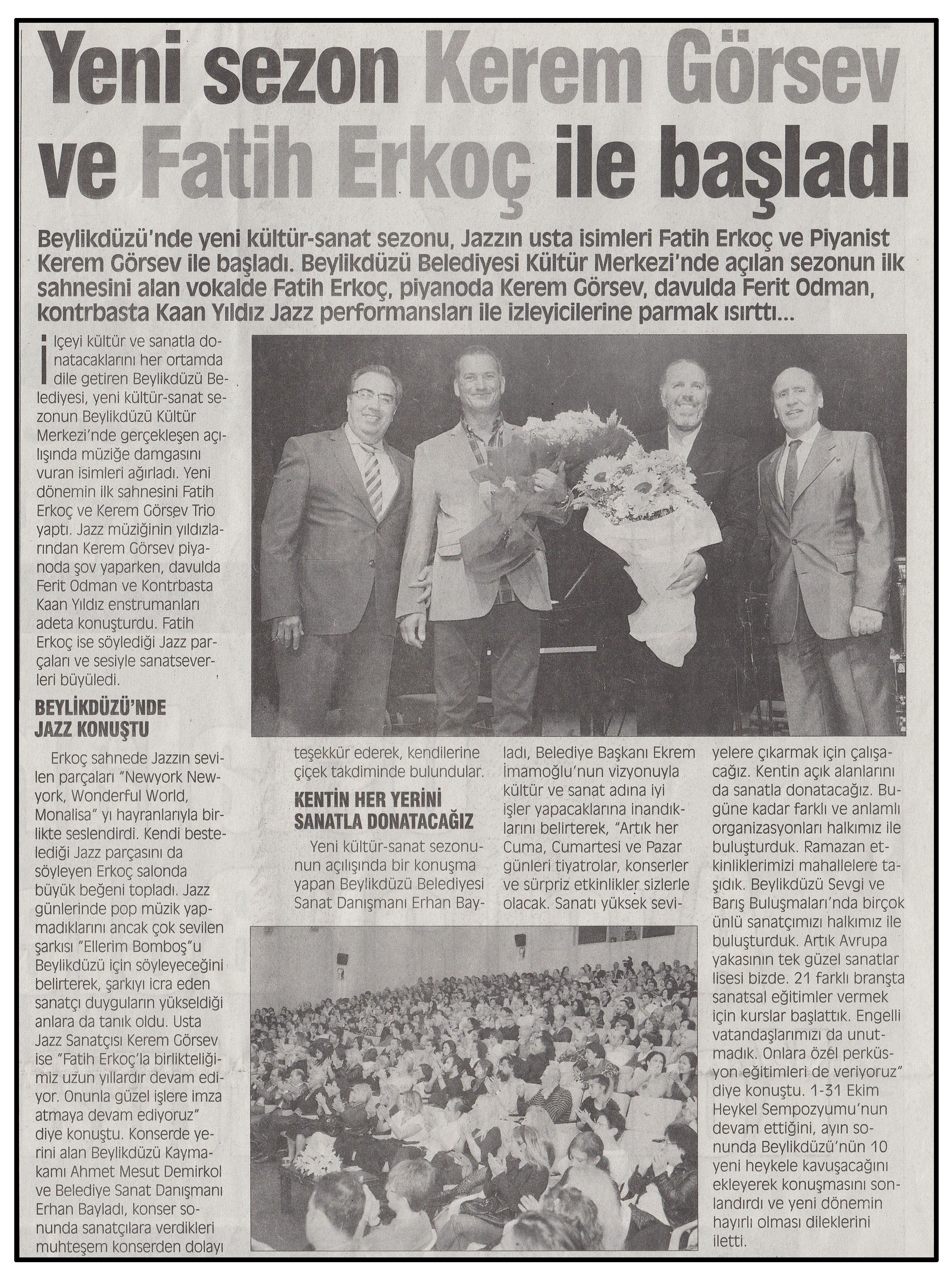 14 Ekim 2014 tarihli ''DEĞİŞİM'' gazetesi. Beylikdüzü'nde yeni kültür-sanat sezonu, Jazzın usta isimleri Fatih Erkoç ve Piyanist Kerem Görsev ile başladı. Beylikdüzü Belediyesi Kültür Merkezi'nde açılan sezonun ilk sahnesini alan vokalde Fatih Erkoç, piyanoda Kerem Görsev, davulda Ferit Odman, kontrbasta Kaan Yıldız Jazz performansları ile izleyicilerine parmak ısırttı..