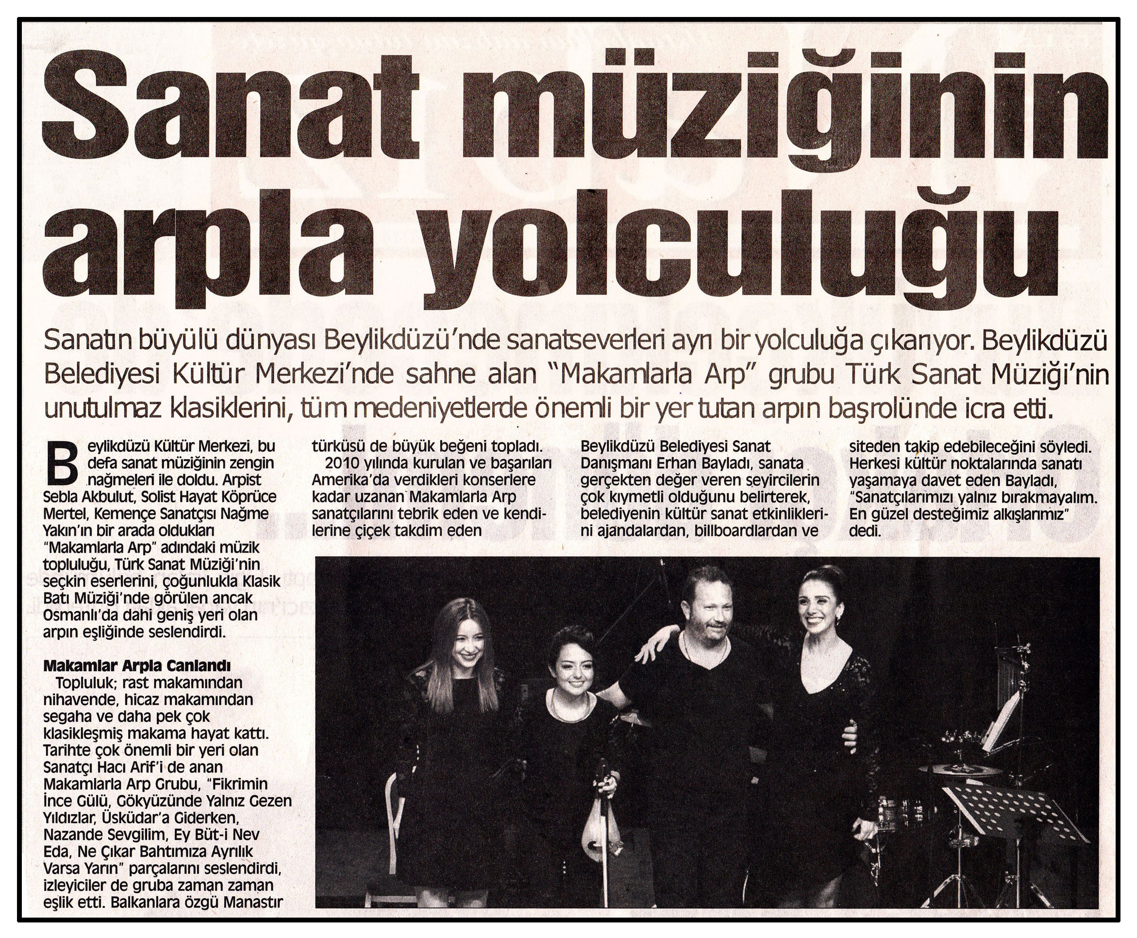 21 Ekim 2014 tarihli ''NABIZ'' gazetesi. Sanatın büyülü dünyası Beylikdüzü'nde sanatseverleri ayrı bir yolculuğa çıkarıyor. Beylikdüzü Belediyesi Kültür Merkezi'nde sahne alan ''Makamlarla Arp'' grubu Türk Sanat Müziği'nin unutulmaz klasiklerini, tüm medeniyetlerde önemli bir yer tutan arpın başrolünde icra etti.