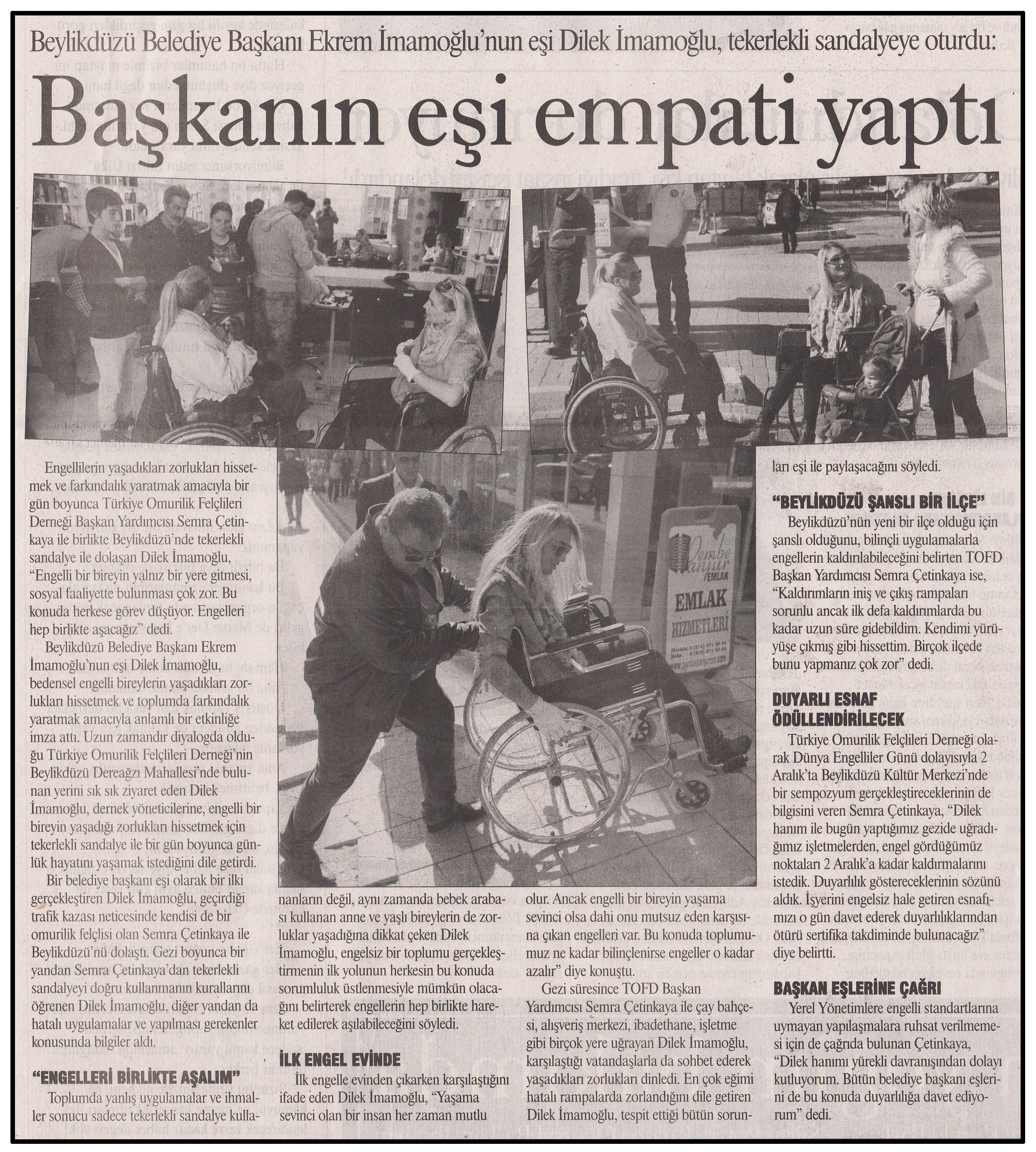 24 Ekim 2014 tarihli ''HABERDAR'' Gazetesi. Engellilerin yaşadıkları zorlukları hissetmek ve farkındalık yaratmak amacıyla bir gün boyunca Türkiye Omurilik Felçlileri Derneği Başkan Yardımcısı Semra Çetinkaya ile birlikte Beylikdüzü'nde tekerlekli sandalye ile dolaştı.