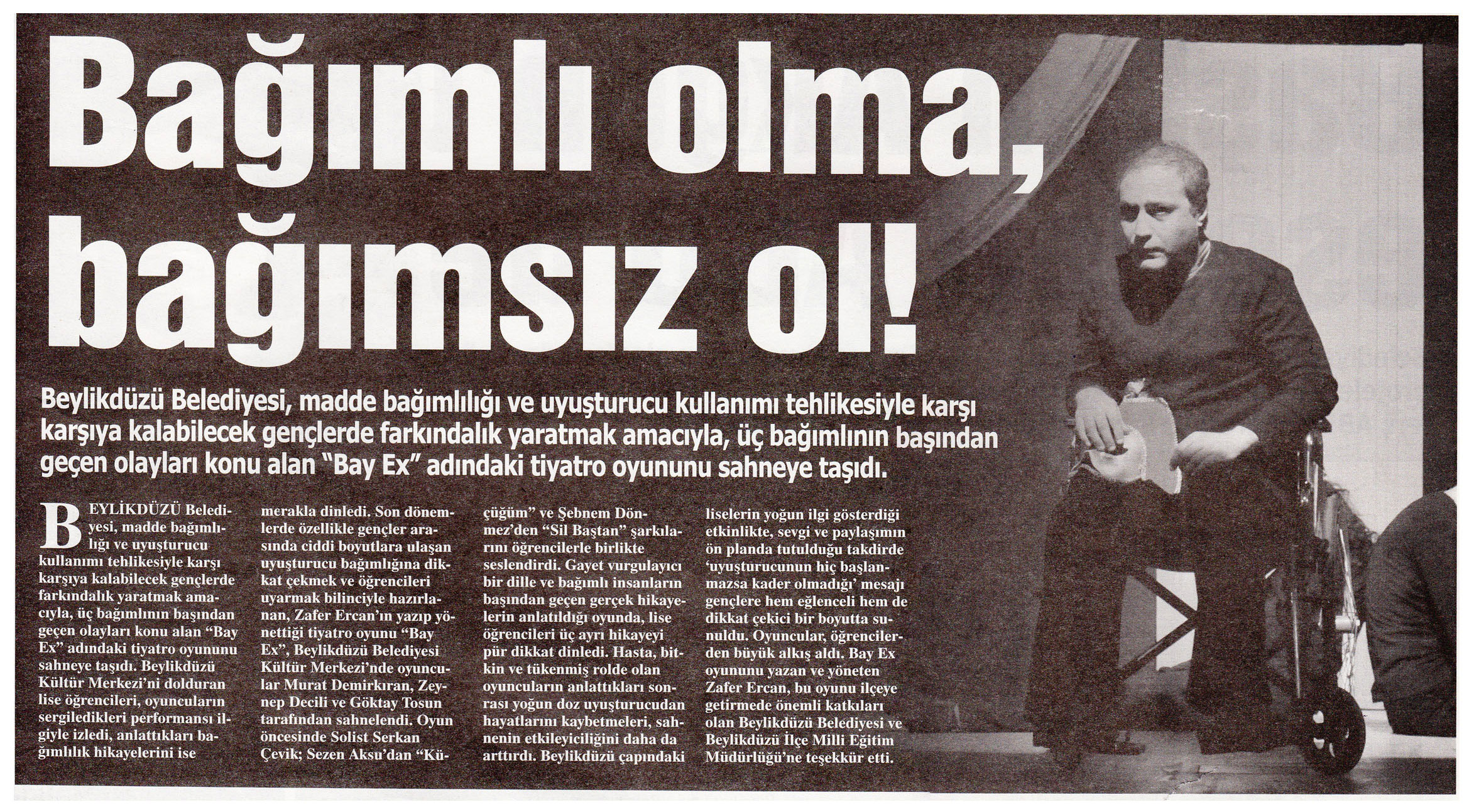 24 Ekim 2014 tarihli ''YENİGÜN'' gazetesi. Beylikdüzü Belediyesi, madde bağımlılığı ve uyuşturucu kullanımı tehlikesiyle karşı karşıya kalabilecek gençlerde farkındalık yaratmak amacıyla, üç bağımlının başından geçen olayları konu alan ''Bay Ex'' adındaki tiyatro oyununu sahneye taşıdı.