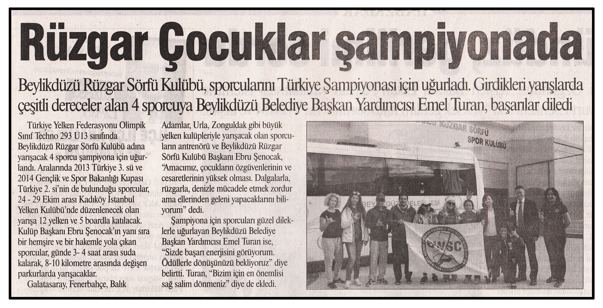 27 Ekim 2014 tarihli ''HABERDAR'' gazetesi. Beylikdüzü Rüzgar Kulubü, sporcularını Türkiye Şampiyonası için uğurladı. Girdikleri yarışlarda çeşitli dereceler alan 4 sporcuya Beylikdüzü Belediye Başkan Yardımcısı Emel Turan, başarılar diledi.