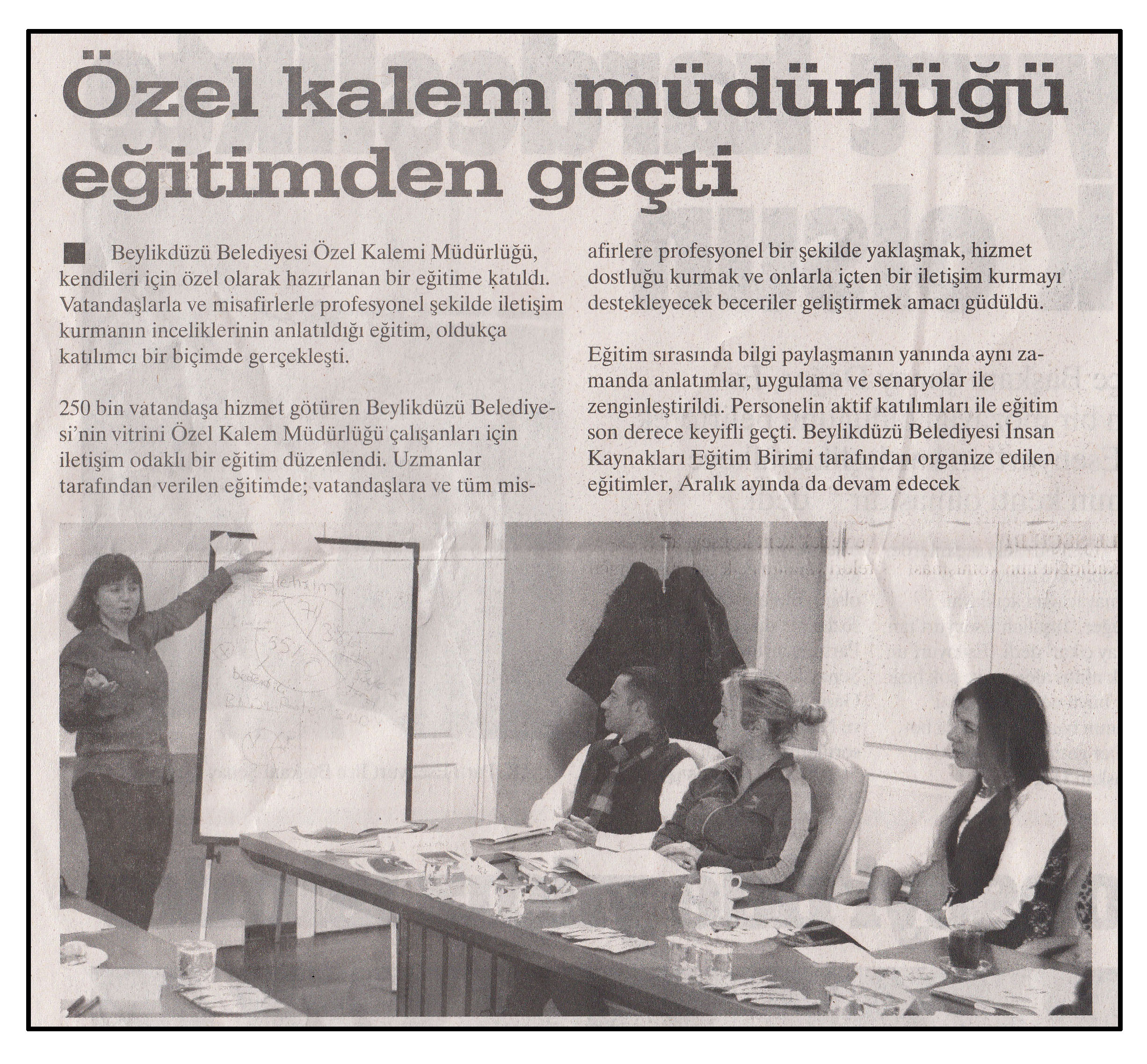 1 Aralık 2014 tarihli ''FARK" gazetesi. Beylikdüzü Belediyesi Özel Kalemi Müdürlüğü, kendileri için özel olarak hazırlanan bir eğitime katıldı. Vatandaşlara ve misafirlere profesyonel bir şekilde iletişim kurmanın inceliklerinin anlatıldığı eğitim, oldukça katılımcı bir biçimde gerçekleşti.