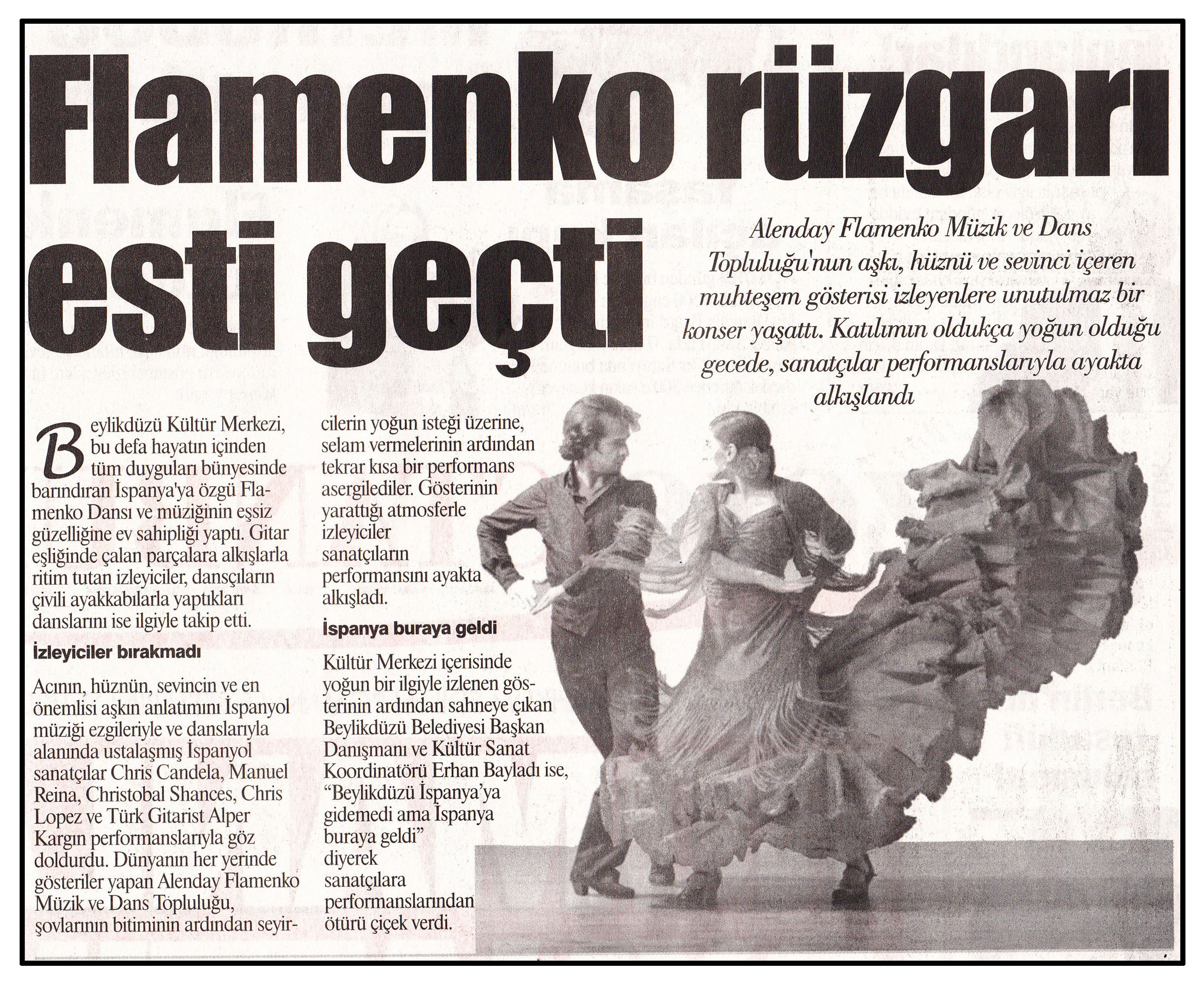 2 Aralık 2014 "GAZETE İSTANBUL" gazetesi. Alenday Flamenko Müzik ve Dans Topluluğu'nun aşkı,hüznü,ve sevinci içeren muhteşem gösterisi Beylikdüzü Belediyesi Kültür Merkezi'nde unutulmaz bir konser yaşattı.