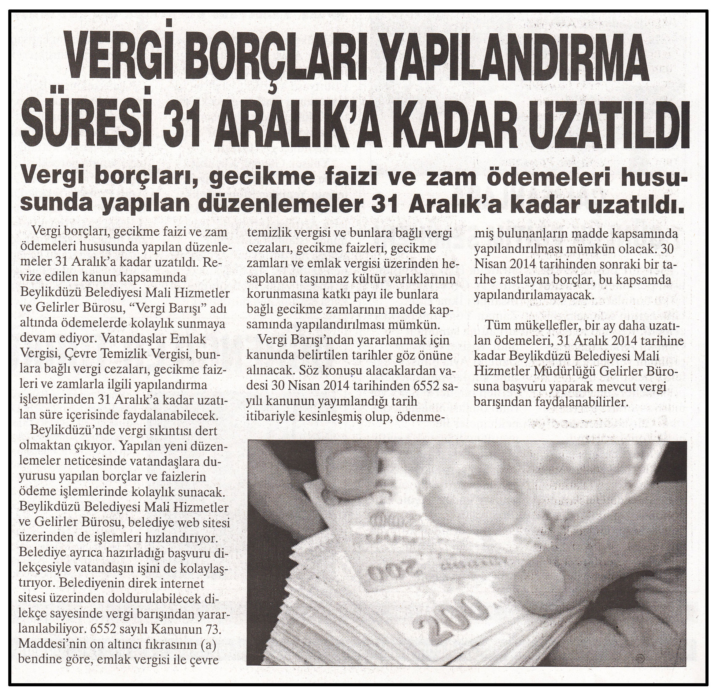 4 Aralık 2014 BÜYÜKÇEKMECE" gazetesi. Vergi borçları, gecikme faizi ve zam ödemeleri hususunda yapılan düzenlemeler 31 Aralık'a kadar uzatıldı.