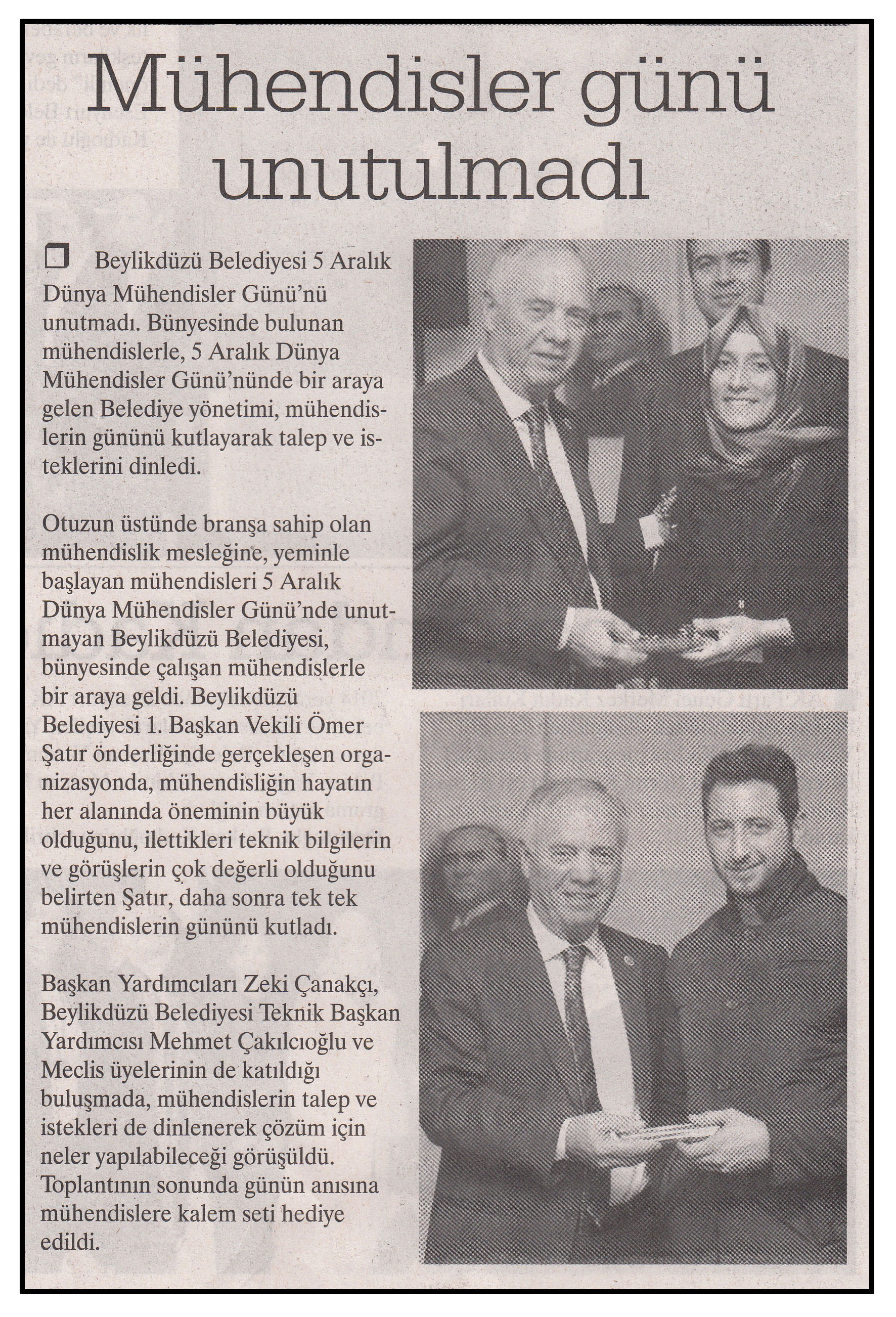 8 Aralık 2014 tarihli "FARK" gazetesi. Beylikdüzü Belediyesi bünyesinde çalışan mühendislerle 5 Aralık Dünya Mühendisler Günü'nde 1.Başkan Vekili Ömer Şatır ile bir araya geldi.