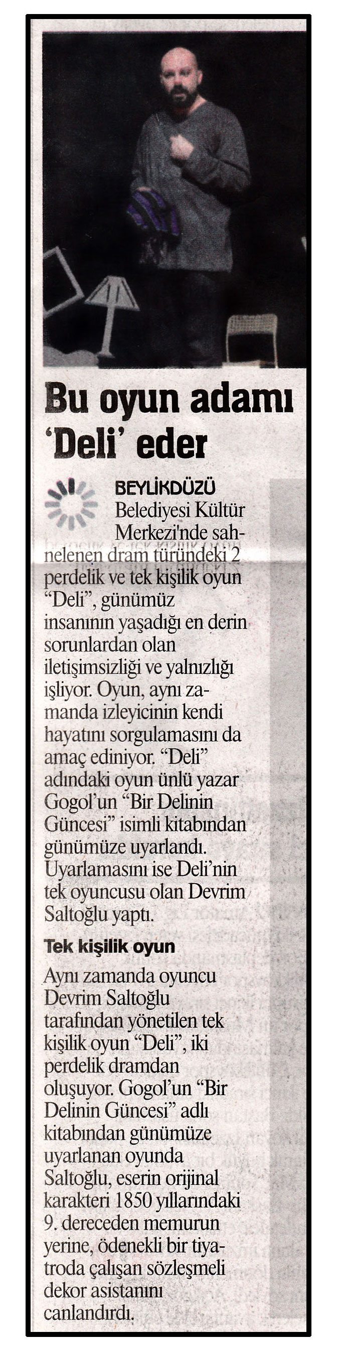 15 Aralık 2014 tarihli "GAZETE İSTANBUL" gazetesi. Beylikdüzü Belediyesi Kültür Merkezi'nde sahnelenen dram türündeki 2 perdelik ve tek kişilik oyun "DELİ" günümüz insanının yaşadığı iletişimsizliği ve yalnızlığı işliyor.