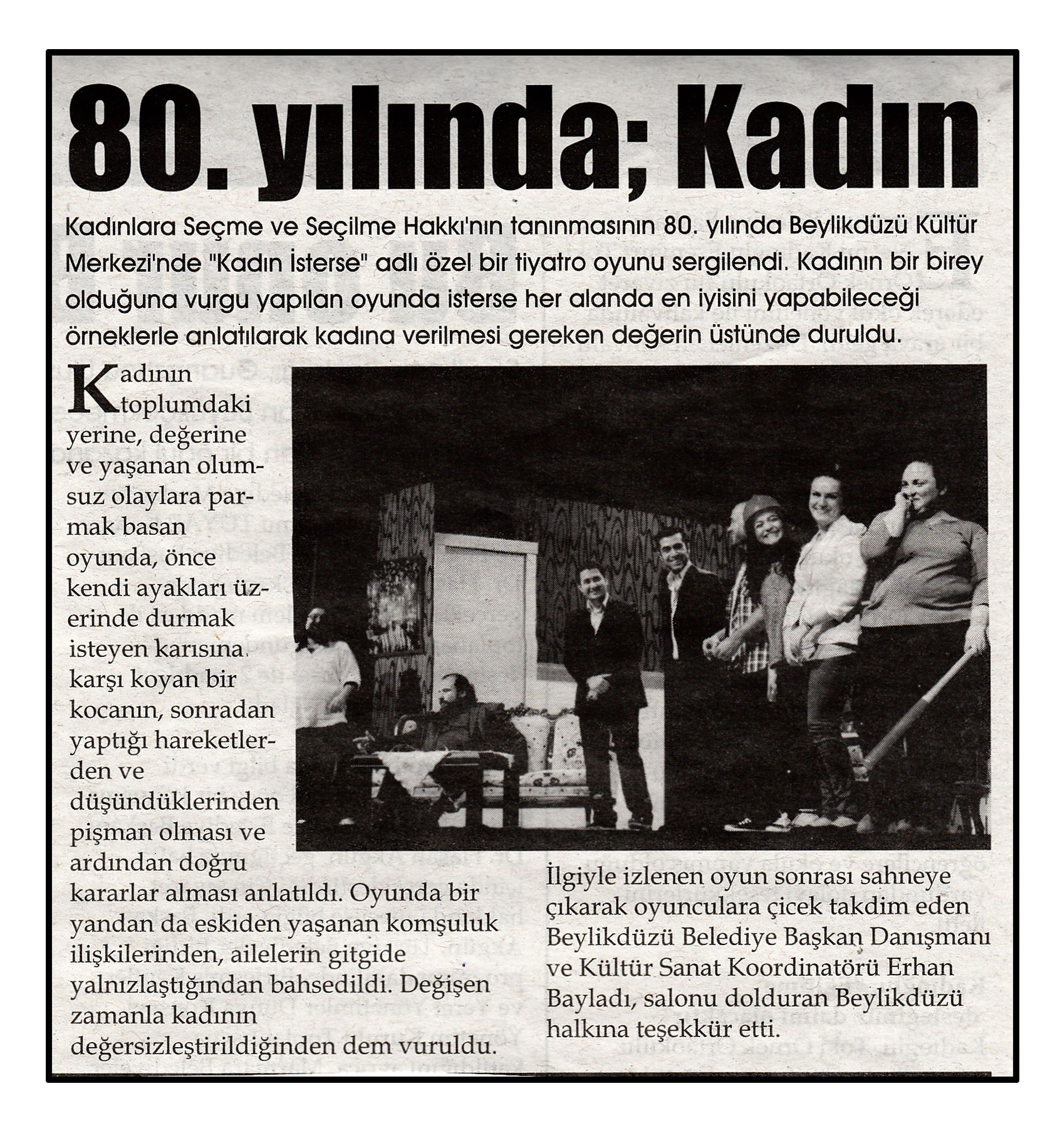 16 Aralık 2014 tarihli "BEYLİKDÜZÜ" gazetesi. Kadınlara Seçme ve Seçilme Hakkı'nın tanınmasının 80. yılında Beylikdüzü Kültür Merkezi'nde "Kadın İsterse" adlı özel bir tiyatro oyunu sergilendi. Başkan Danışmanı Erhan Bayladı, salonu dolduran Beylikdüzü halkına teşekkkür etti.