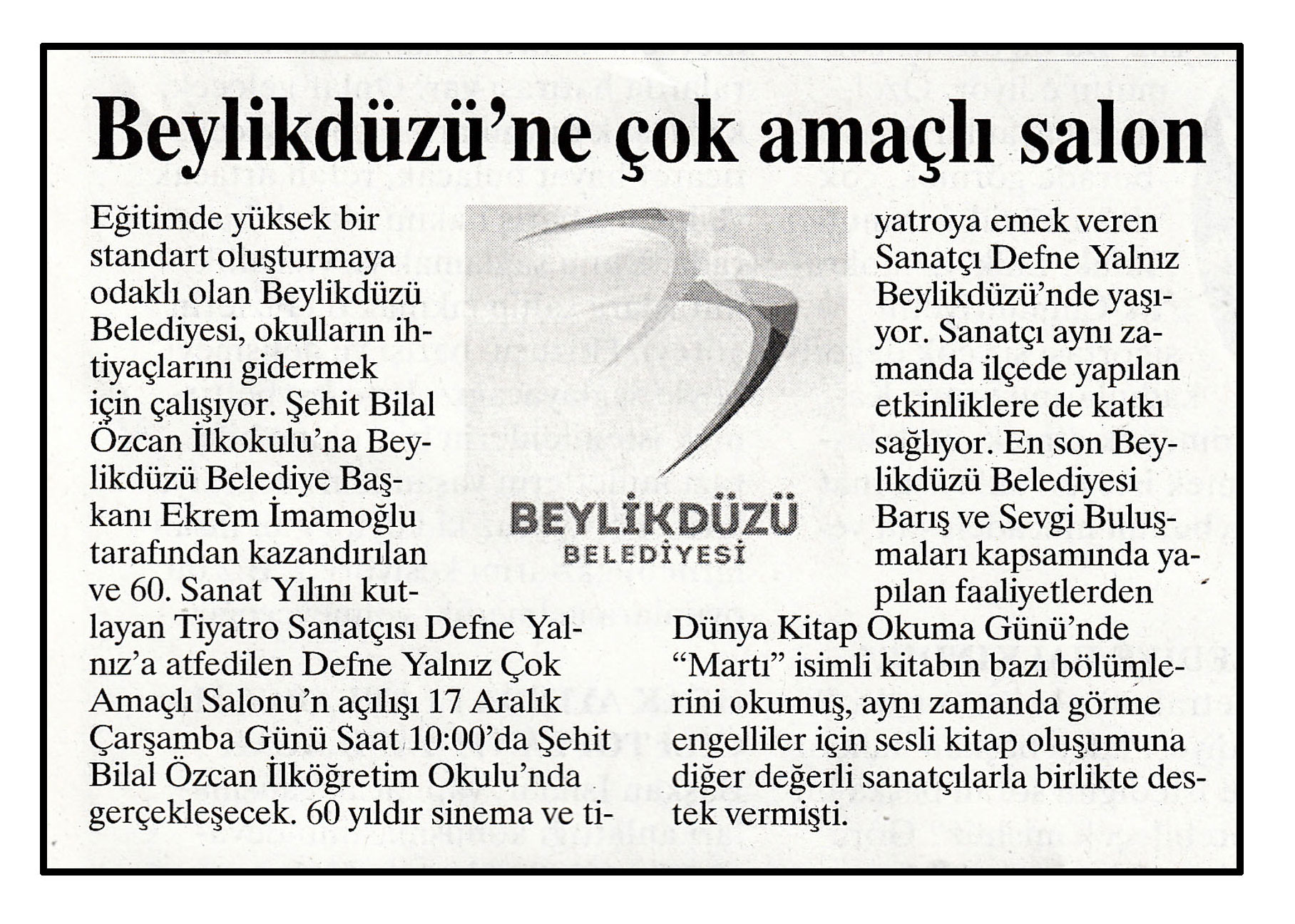 17 Aralık 2014 "YENİ GÜN" gazetesi. Beylikdüzü Belediye Başkanı Ekrem İmamoğlu tarafından kazandırılan ve 60. Sanat Yılını Kutlayan Tiyatro Sanatçısı Defne Yalnız'a atfedilen Defne Yalnız Çok Amaçlı Salonun açılışı, Şehit Bilal Özcan İlköğretim Okulun'da gerçekleşecek.