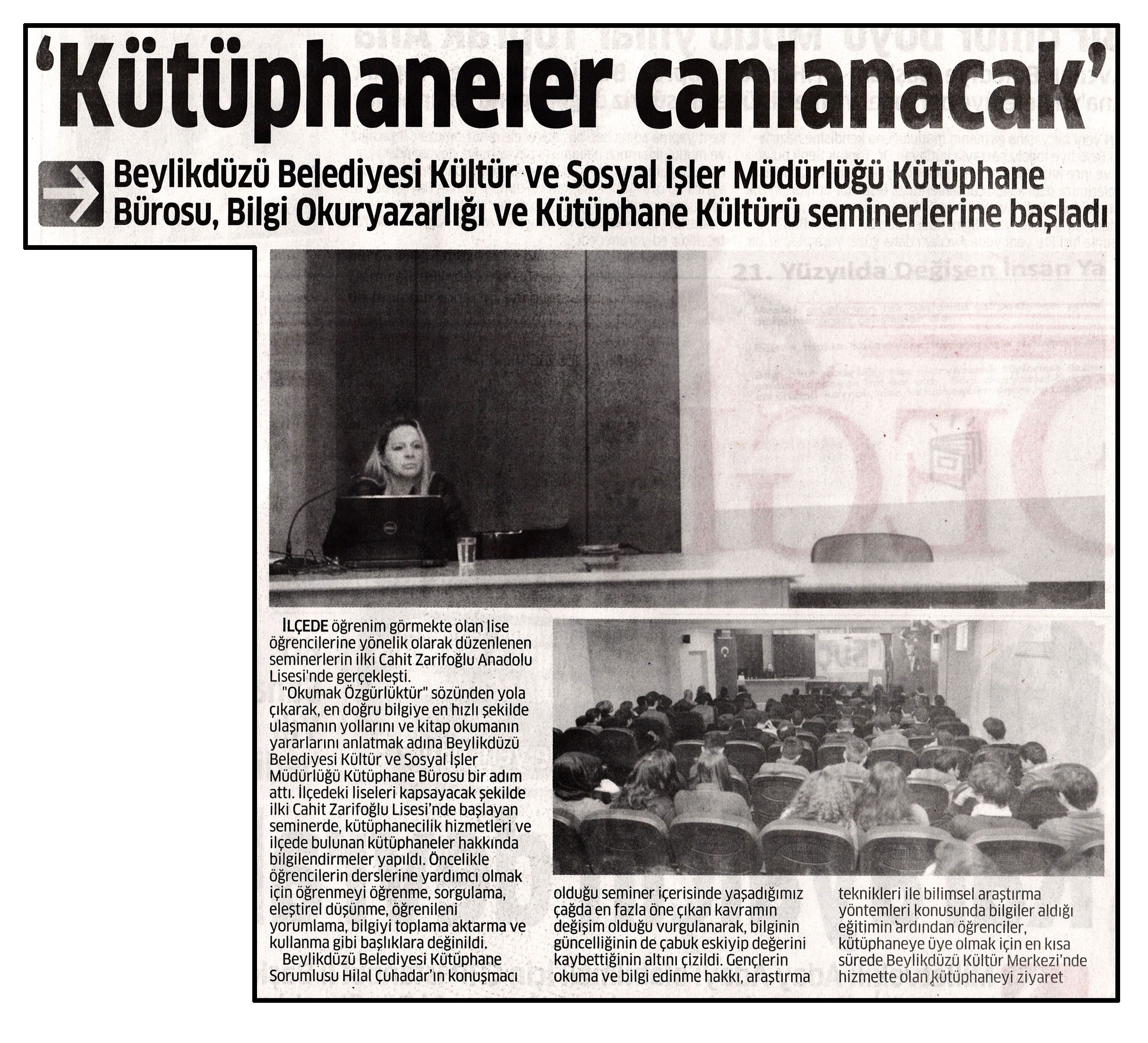 18 Aralık 2014 tarihli "DEĞİŞİM" gazetesi. Beylikdüzü Belediyesi Kültür ve Sosyal İşler Müdürlüğü Kütüphane Bürosu, Bilgi Okur yazarlığı ve Kütüphane Kültürü seminerlerine başladı.