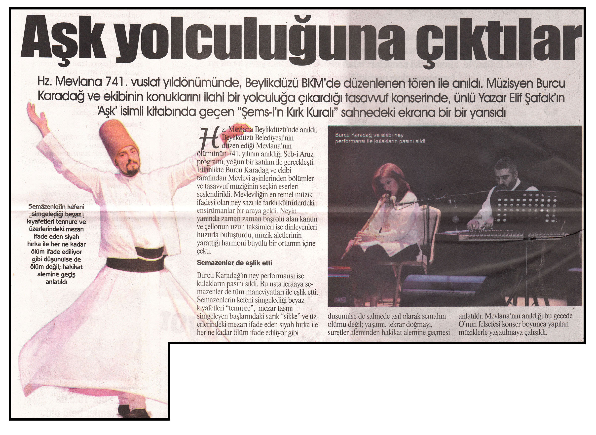 19 Aralık 2014 tarihli "GAZETE İSTANBUL" gazetesi. Hz. Mevlana 741. vuslat yıl dönümünde, Beylikdüzü, BKM'de düzenlenen tören ile anıldı. Burcu Karadağ ve ekibi ney performansı ile kulakların pasını sildi.