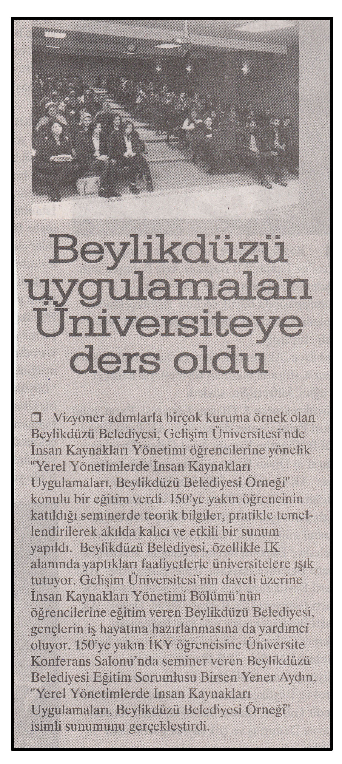 22 Aralık 2014 tarihli "FARK" gazetesi. Beylikdüzü Belediyesi, Gelişim Üniversitesi'nde İnsan Kaynakları Yönetimi öğrencilerine yönelik "Yerel Yönetimlerde İnsan Kaynakları Uygulamaları, Beylikdüzü Belediyesi Örneği" konulu bir eğitim verdi.