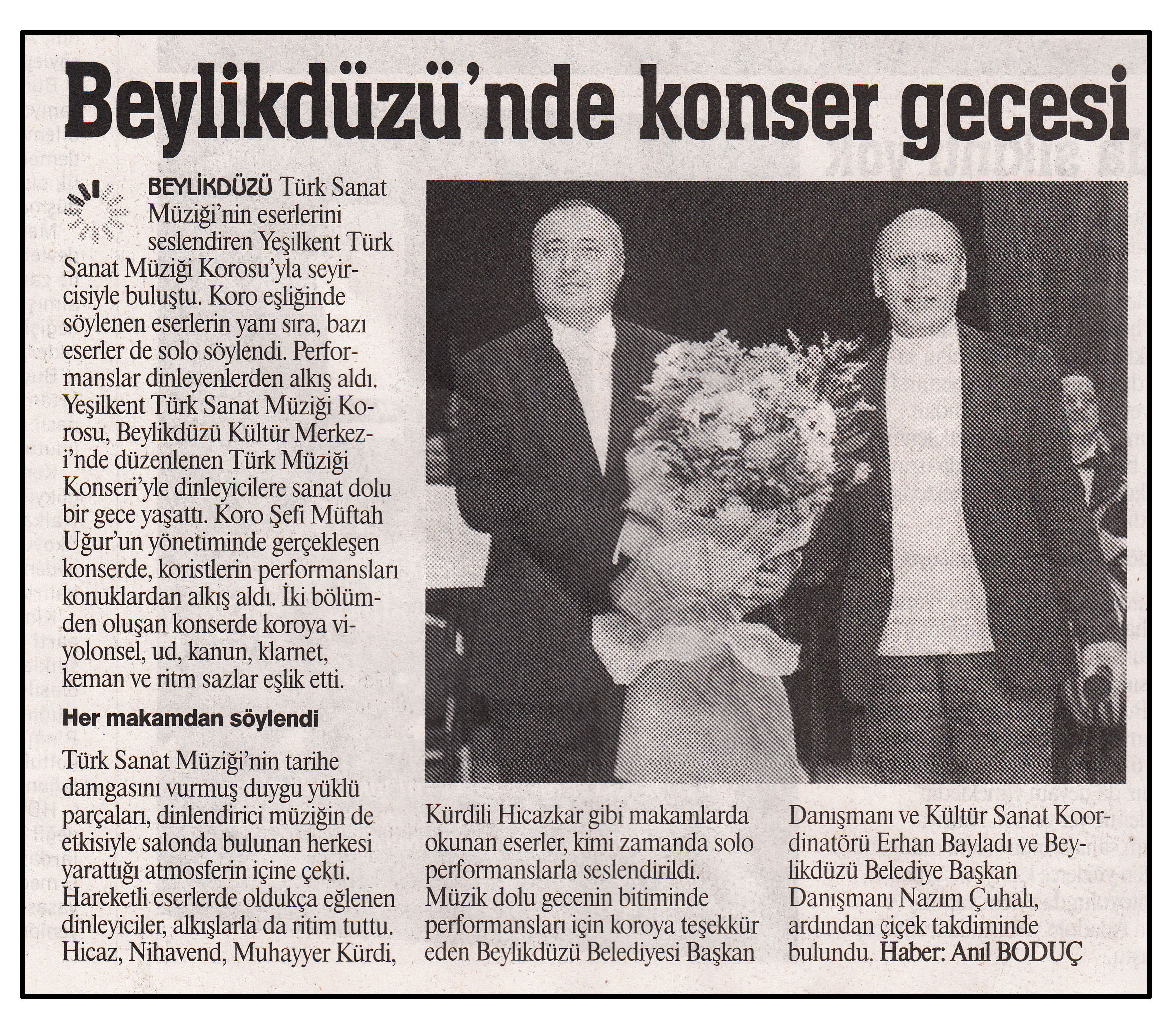 24 Aralık 2014 tarihli "GAZETE İSTANBUL" gazetesi. Beylikdüzü Türk Sanat Müziği'nin eserlerini seslendiren Yeşilkent Türk Sanat Müziği Korosu'yla seyircisiyle buluştu.