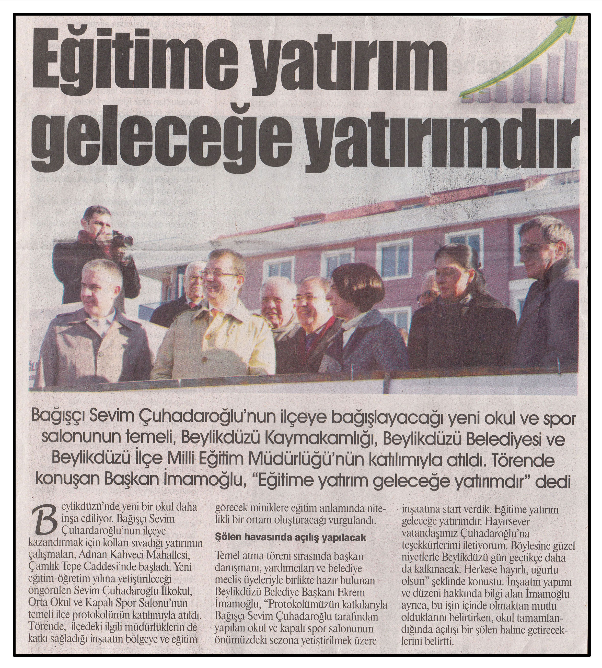24 Aralık 2014 "GAZETE İSTANBUL" gazetesi. Bağışçı Sevim Çuhadaroğlu'nun ilçeye bağışlayacağı yeni okul ve spor salonunun temeli, Beylikdüzü Kaymakamlığı, Beylikdüzü Belediyesi ve Beylikdüzü İlçe Milli Eğitim Müdürlüğü'nün katılımıyla atıldı. Törende konuşan Başkan İmamoğlu, "Eğitime yatırım geleceğe yatırımdır" dedi.