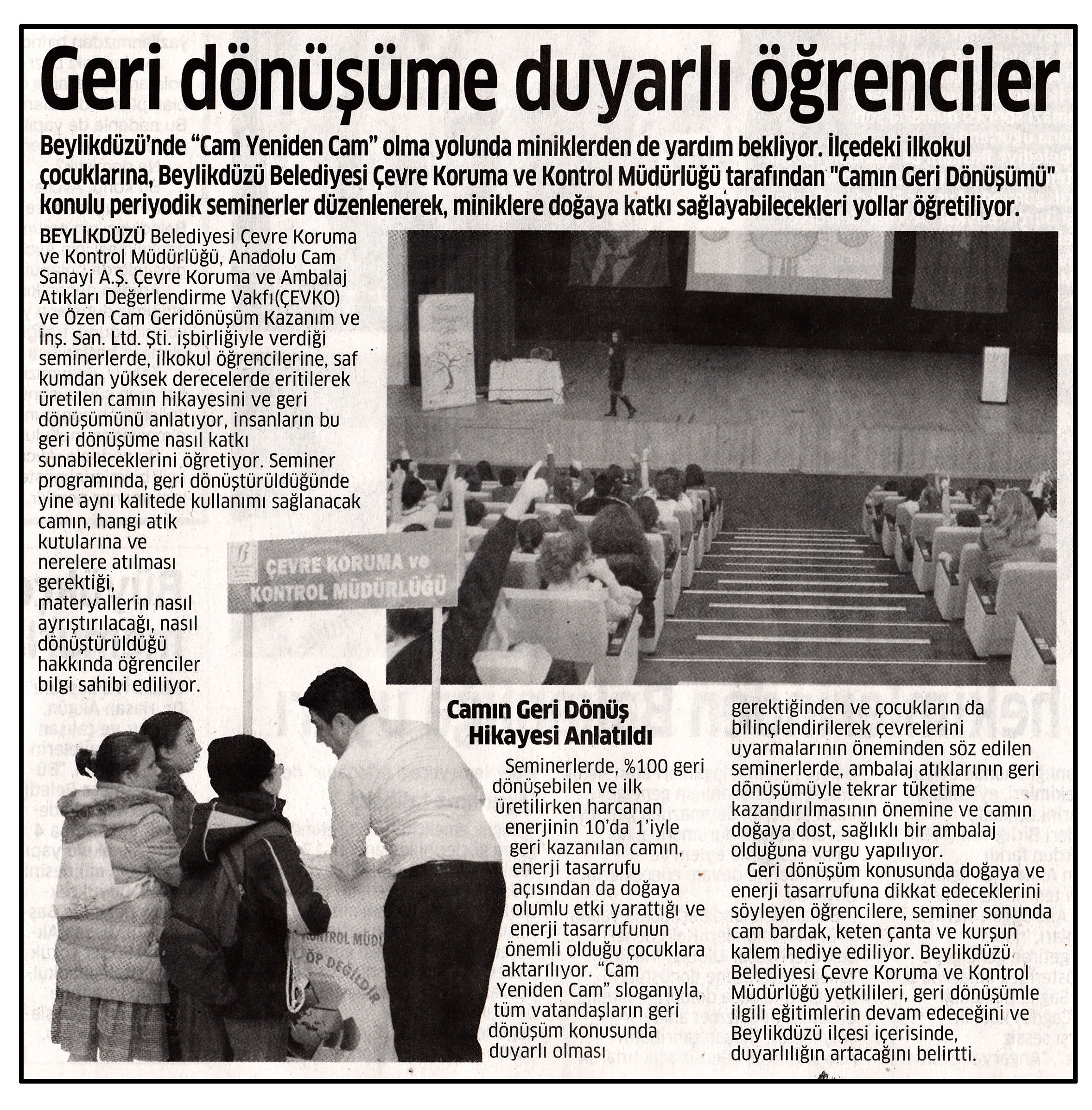 15 Aralık 2014 tarihli "DEĞİŞİM" gazetesi. Beylikdüzü Belediyesi Çevre Koruma ve Kontrol Müdürlüğü tarafından " Camın Geri Dönüşümü" konulu seminerler düzenlenerek, miniklere doğaya katkı sağlayabilecekleri yollar öğretiliyor.