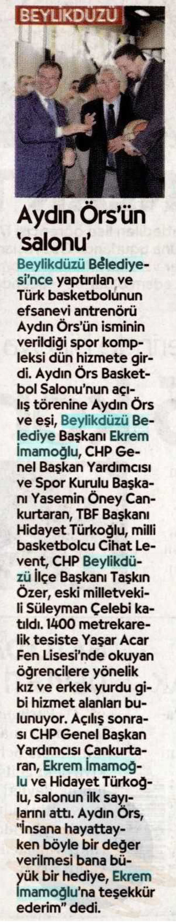 15 Ekim 2017 tarihli "CUMHURİYET" gazetesi. Beylikdüzü Belediyesi'nce yaptırılan ve Türk basketbolunun efsanevi antrenörü Aydın Örs'ün isminin verildiği spor komplesi hizmete girdi.