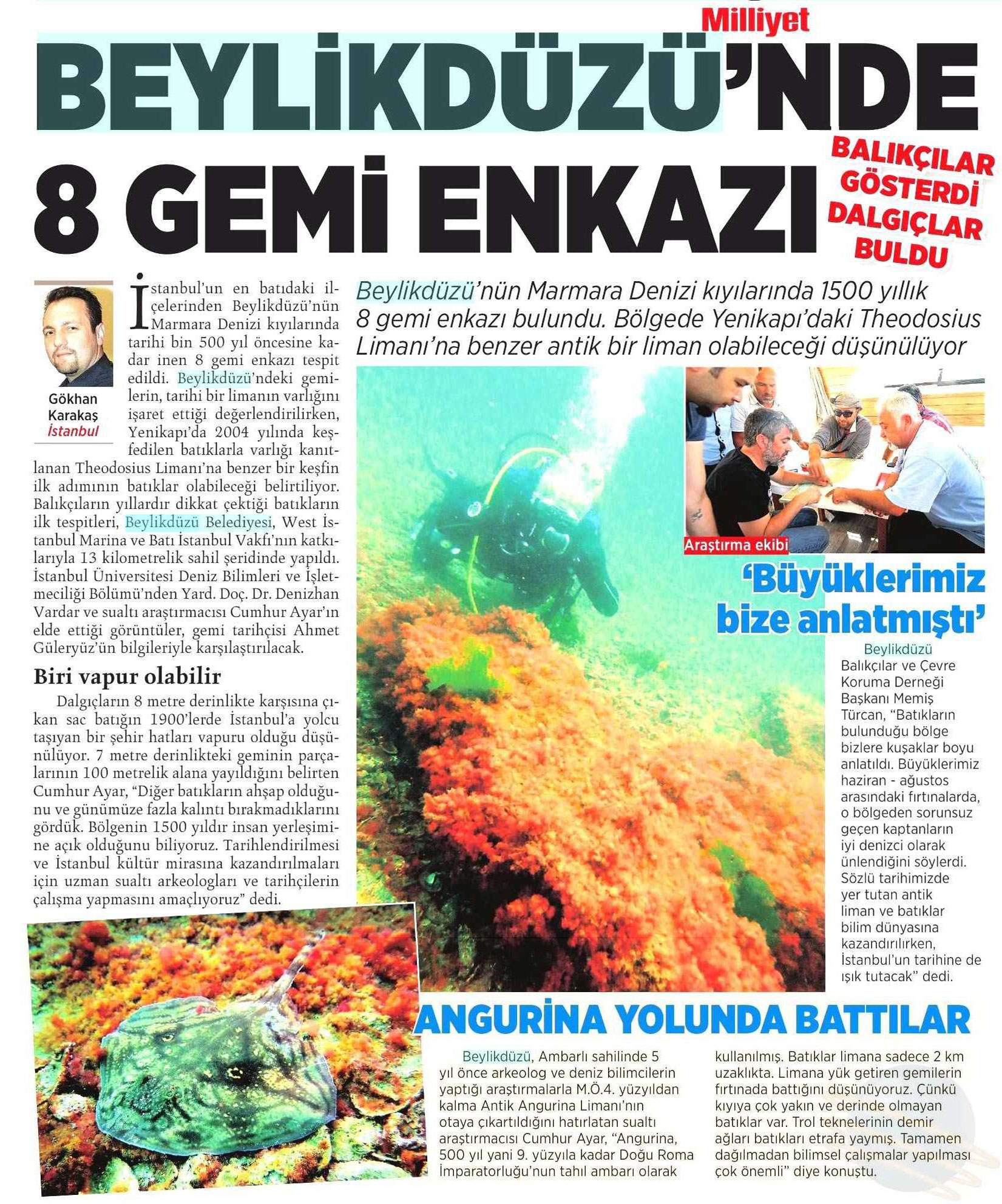 23 Ekim 2017 tarihli "MİLLİYET" gazetesi. Beylikdüzü'nün Marmara Denizi kıyılarında 1500 yıllık 8 gemi enkazı bulundu. Bölgede Yenikapı'daki Theodosius Limanı'na benzer antik bir liman olabileceği düşünülüyor.