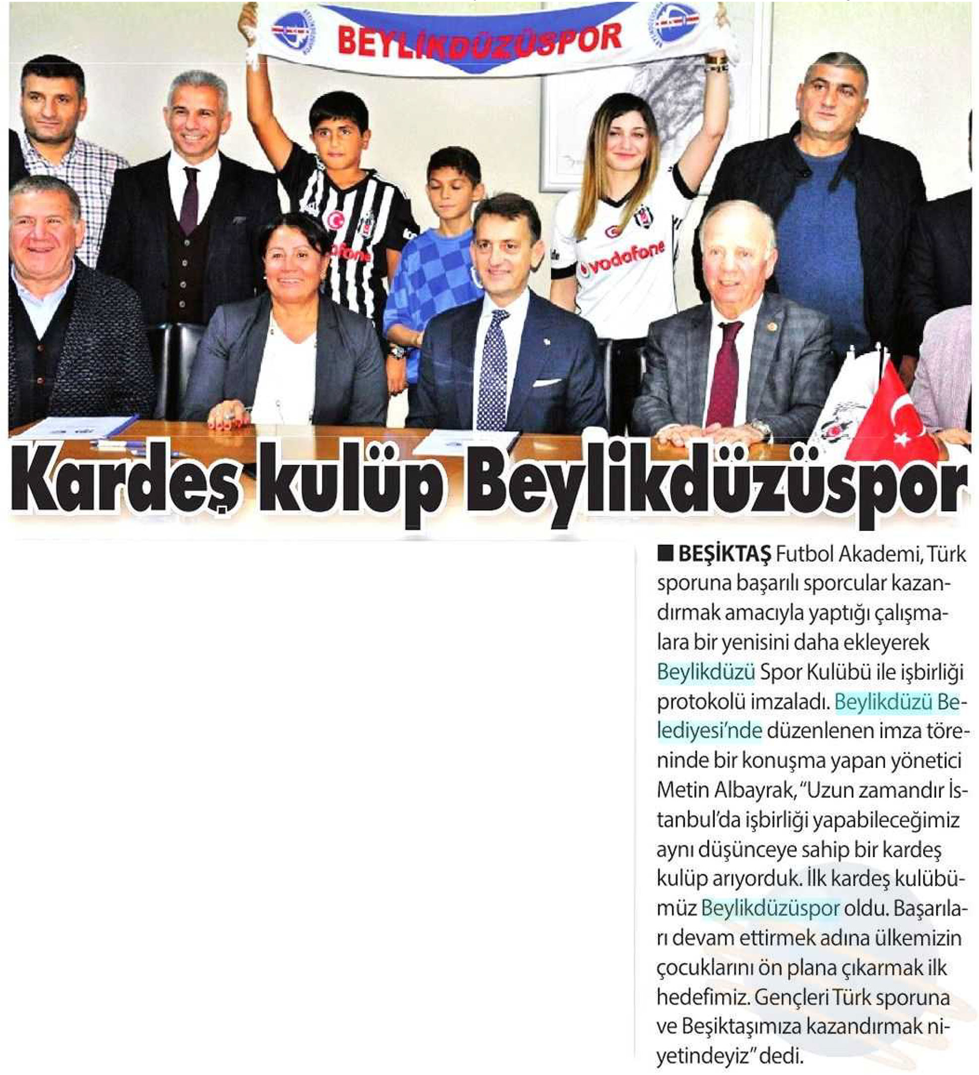 27 Ekim 2017 tarihli "GÜNEŞ" gazetesi. Beşiktaş Futbol Akademisi, Türk sporuna başarılı sporcular kazandırmak amacıyla; Beylikdüzü Spor Kulübü ile iş birliği protokolü imzaladı. İmza töreni Beylikdüzü Belediyesi'nde gerçekleşti.